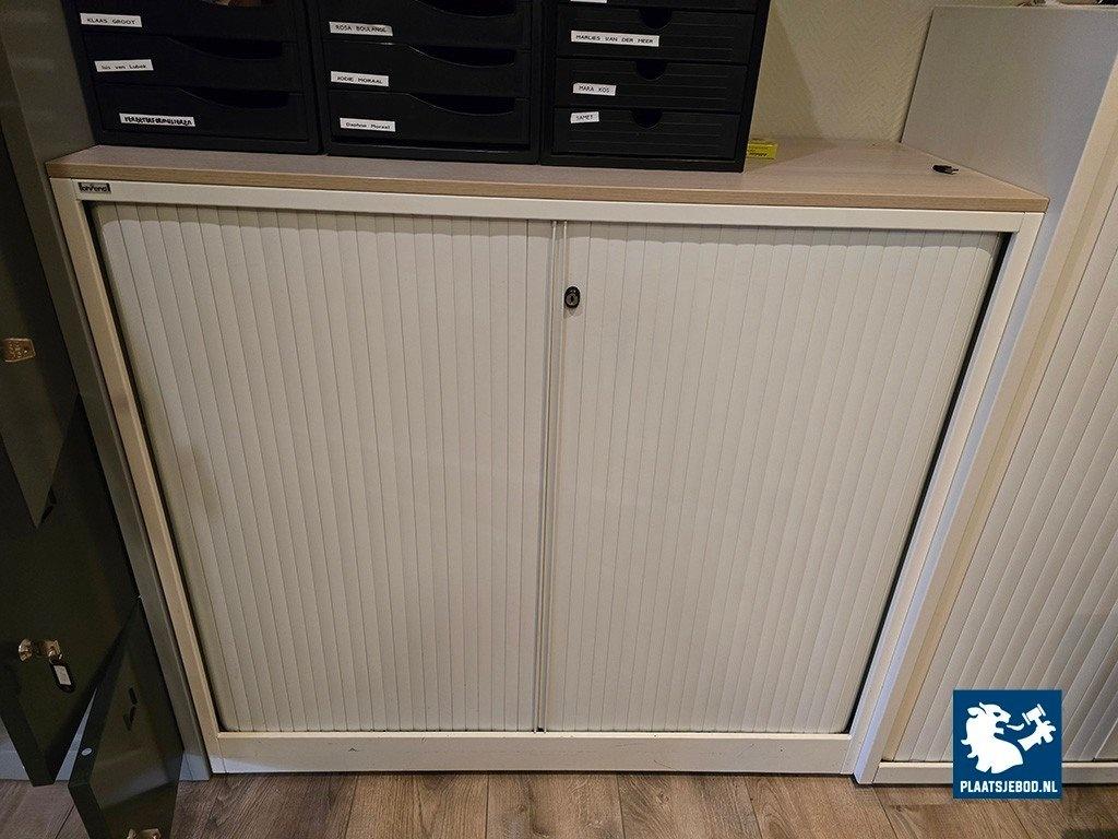 2 x Archiefkast met jaloeziedeuren ca. 100 x 45 x 110 en 110 x 45 x 130, whiteboard, etc.