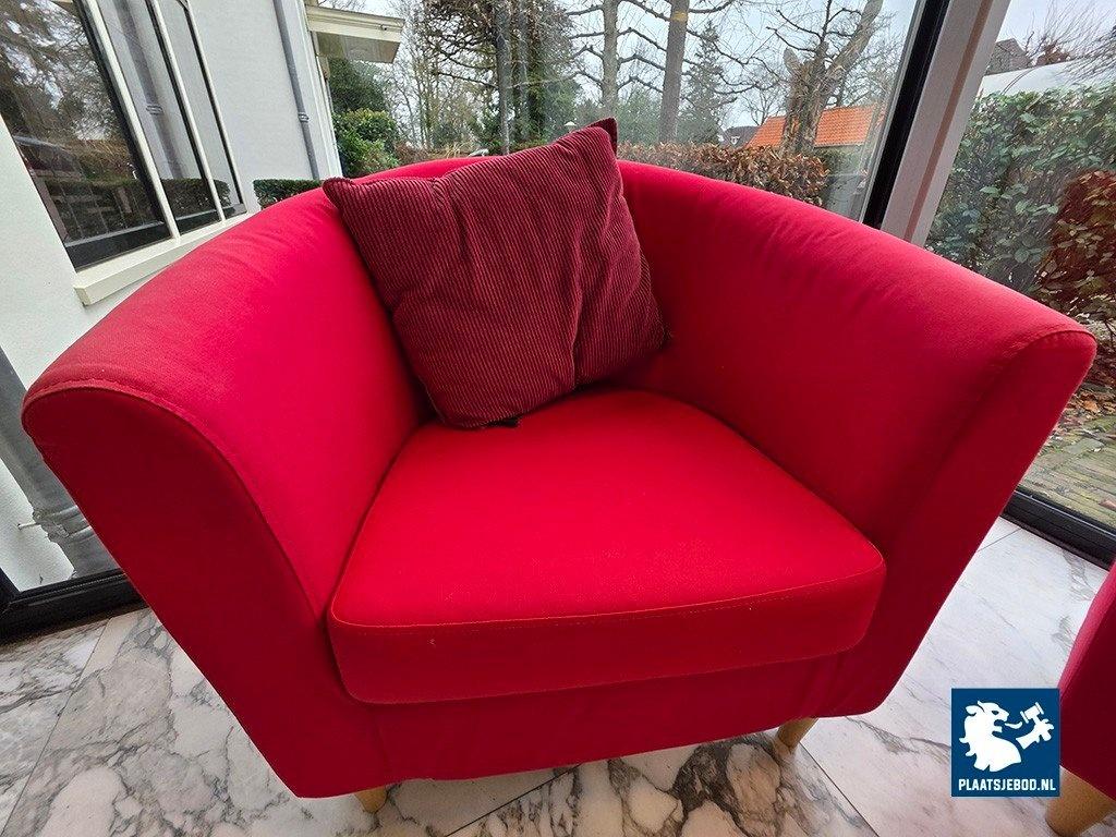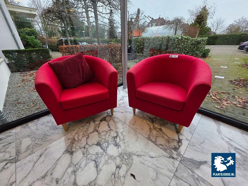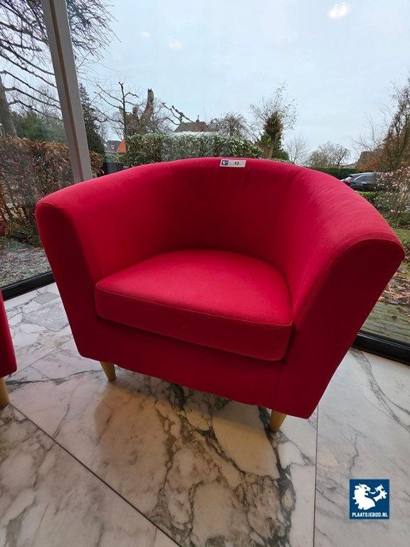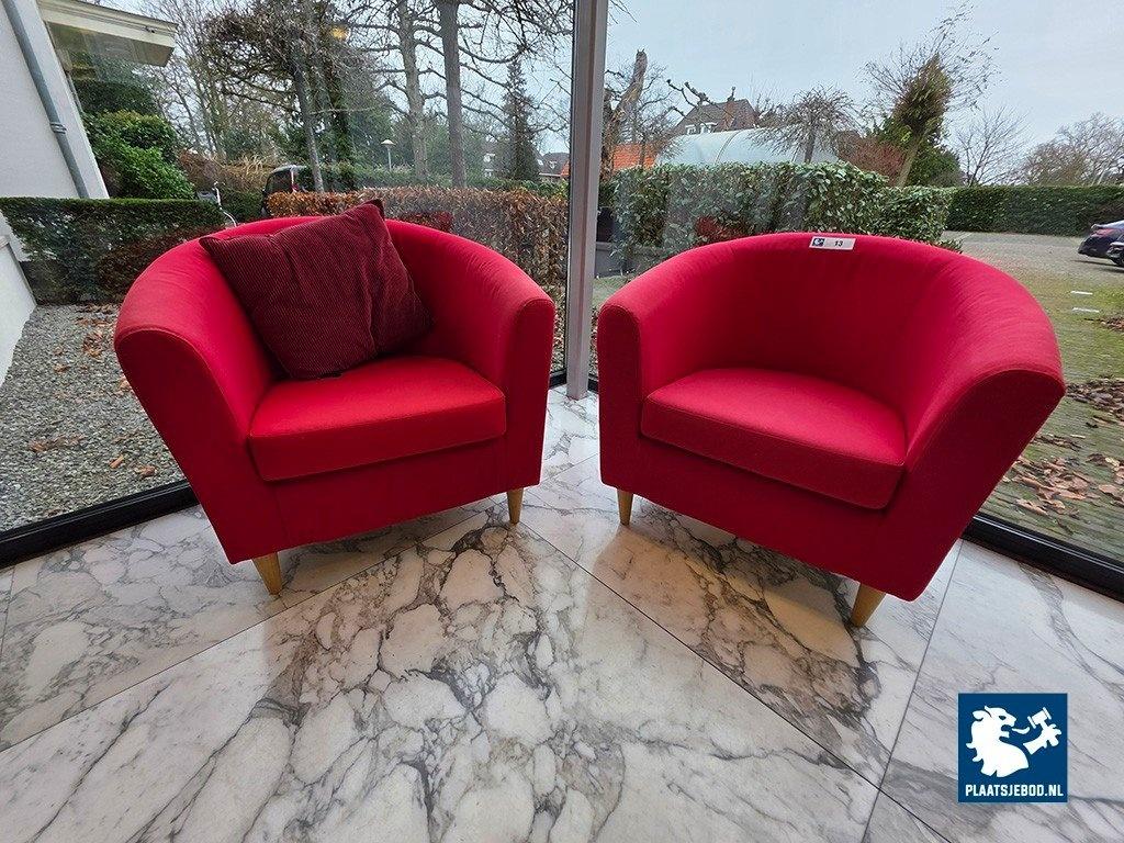 Kavel 300-013: 2 x Gestoffeerde fauteuil met vloerstaand magazinerek