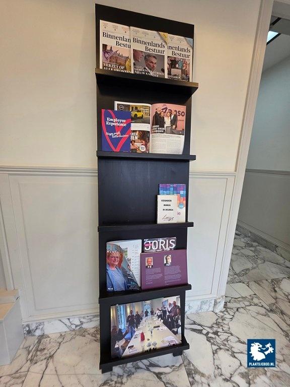 2 x Gestoffeerde fauteuil met vloerstaand magazinerek ca. 56 x 215 cm