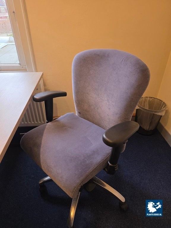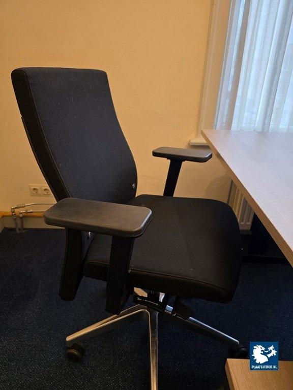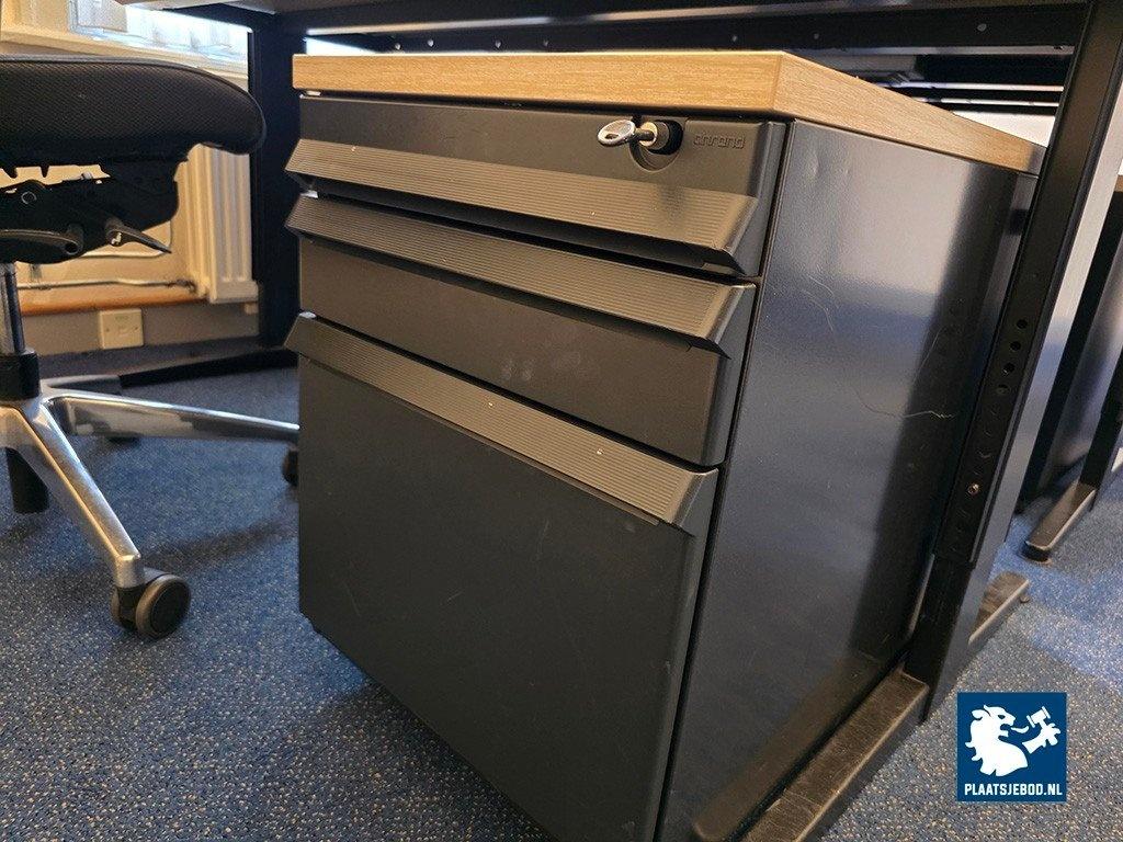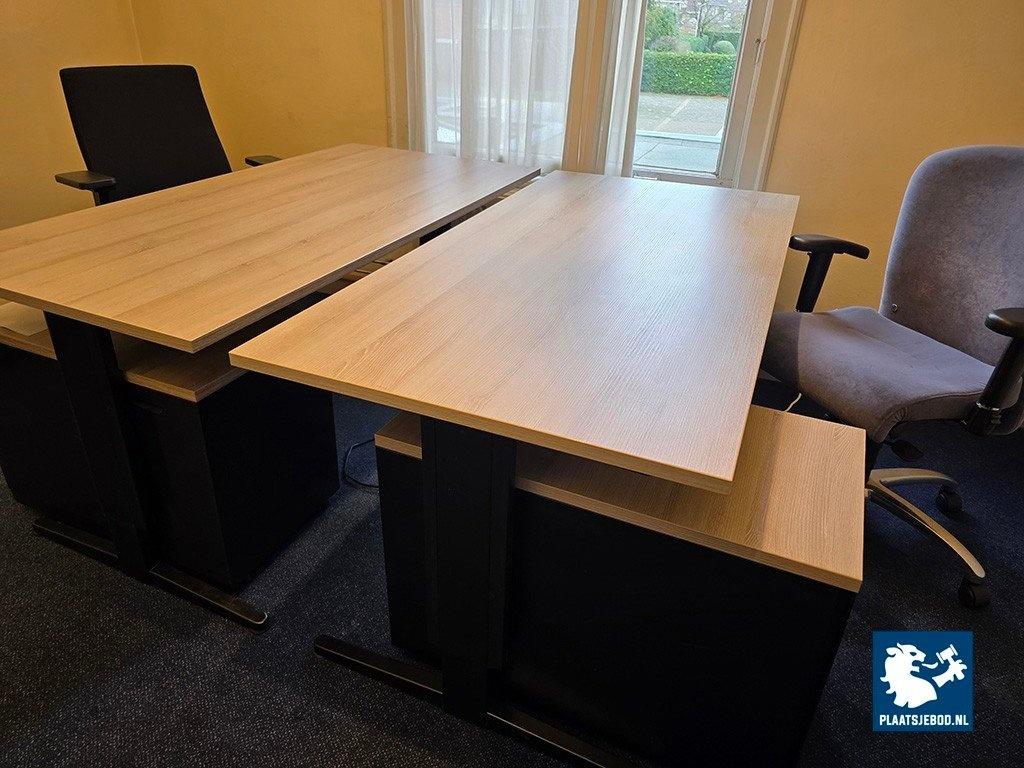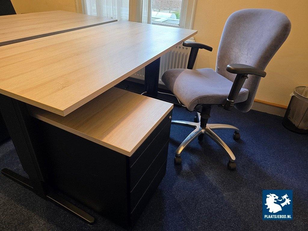 2 x In hoogte verstelbaar bureau ca. 160 x 80 cm met verrijdbare gasgeveerde bureaustoel met armleggers en verrijdbaar ladeblok