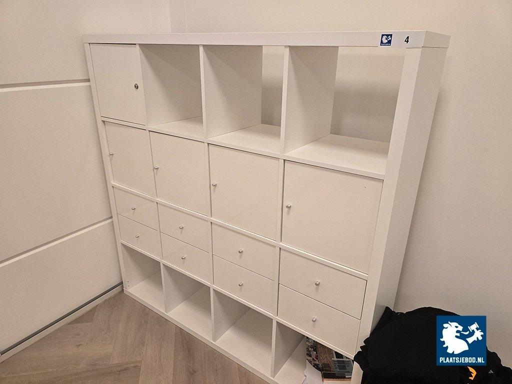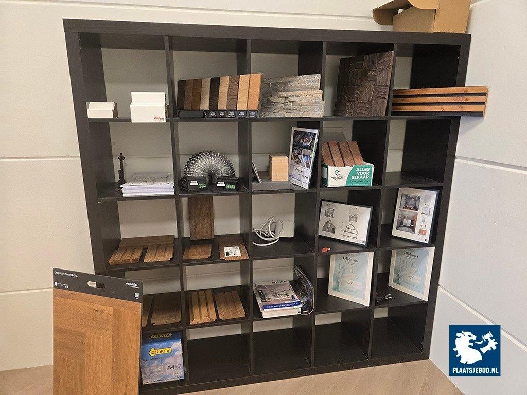 2 x Open vakken kast ca. 147 x 40 x 147 cm en 185 x 40 x 185 cm met diverse inhoud waaronder demo materialen