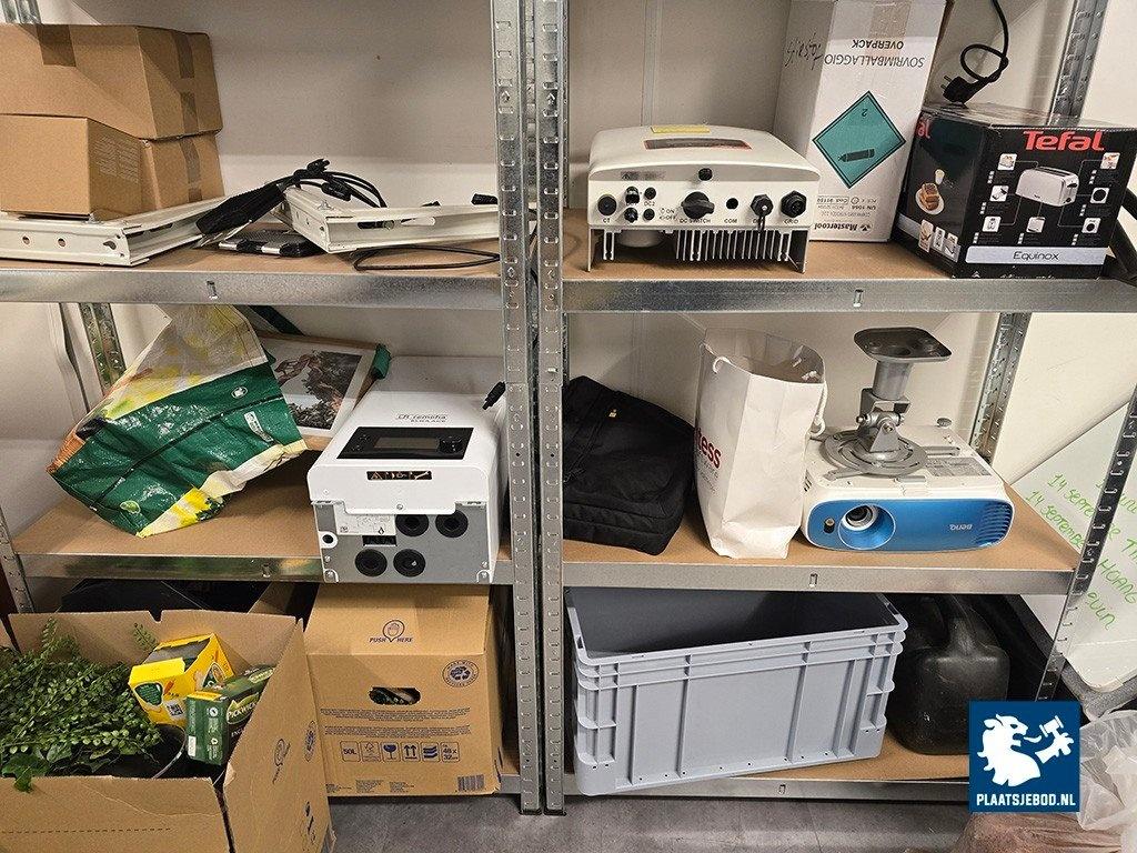 2 x Sectie magazijnstelling met inhoud w.o. monitoren, netwerkswitch, LCD Projector, steunen en diverse onderdelen