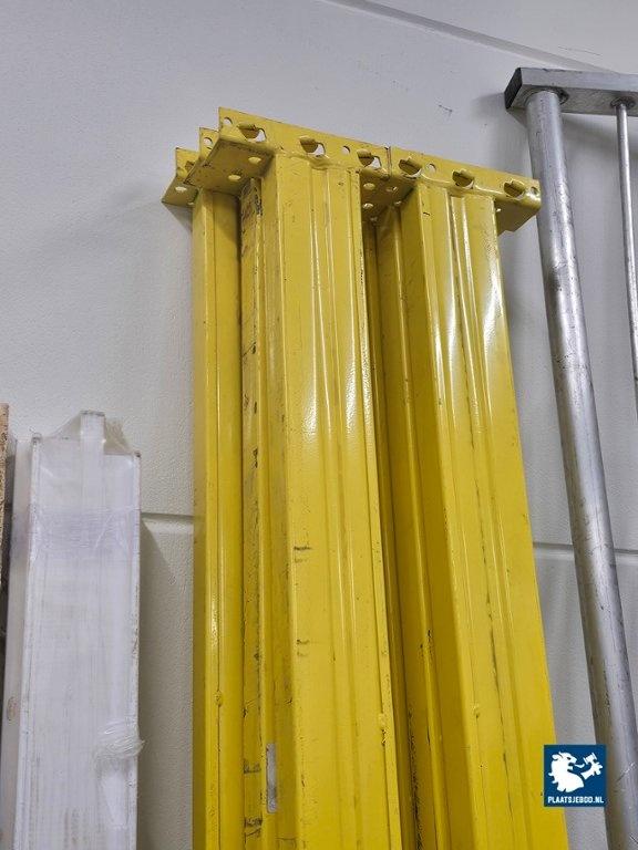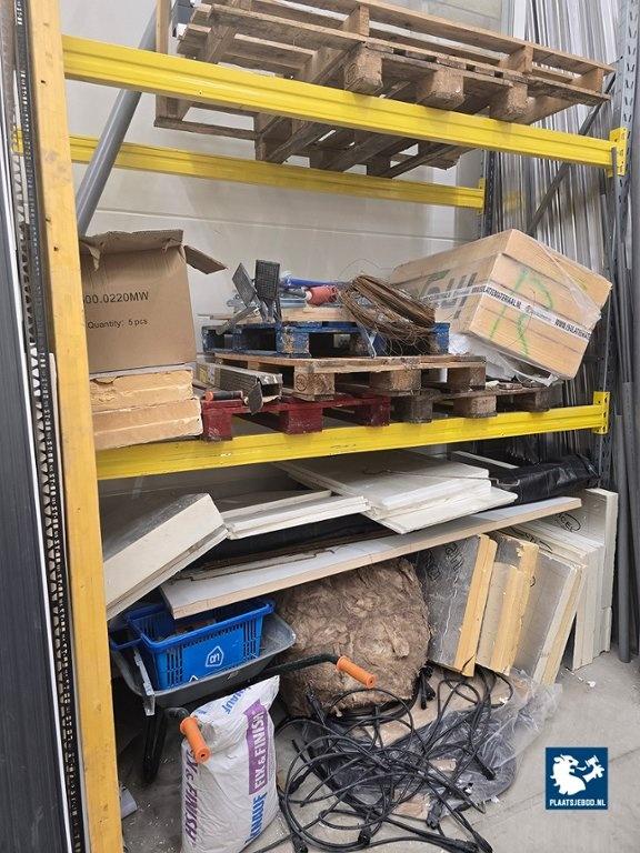 2 x Sectie palletinhaakstelling ca. 270 x 100 x 300 cm, 3 x staander, 14 x legger met diverse inhoud waaronder isolatiemateriaal, stempels, kozijn, tegels, systeem plafond tegels, etc.
