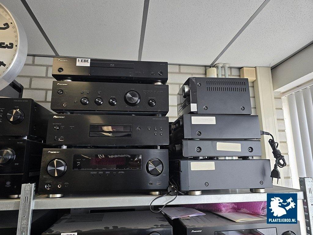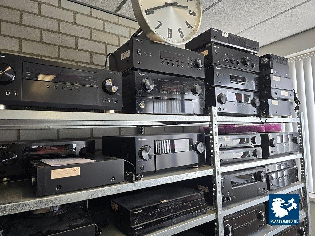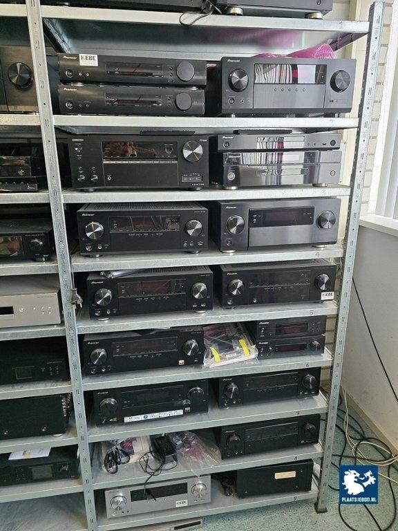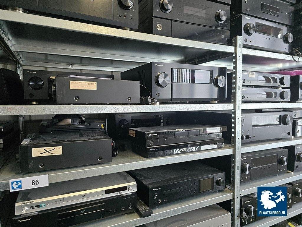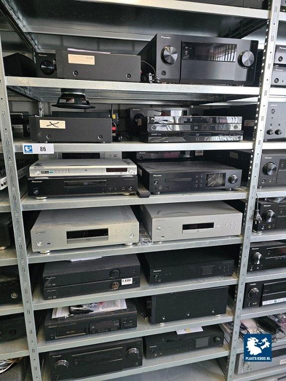 2 x Sectie stelling met diverse inhoud waaronder diverse Blu-Ray/ CD spelers, receivers, etc.