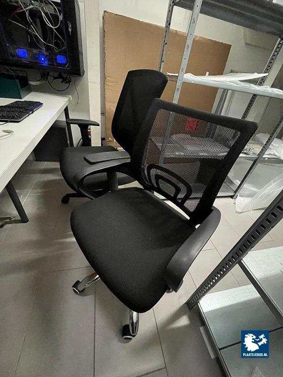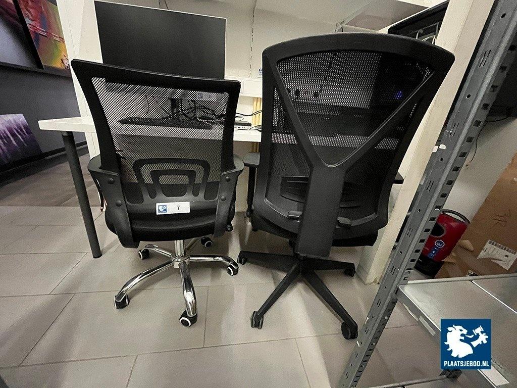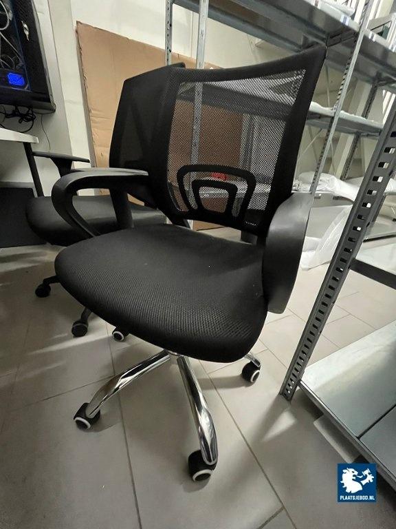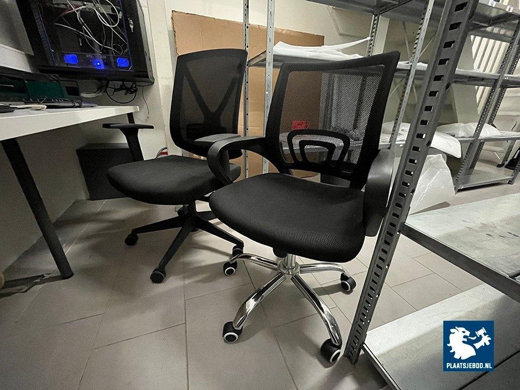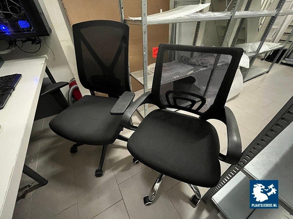 2 x Zwarte bureaustoel met armleggers en gasgeveerde zitting, in hoogte verstelbaar, één stoel met chrome onderstel, één stoel met zwarte onderstel
