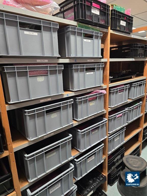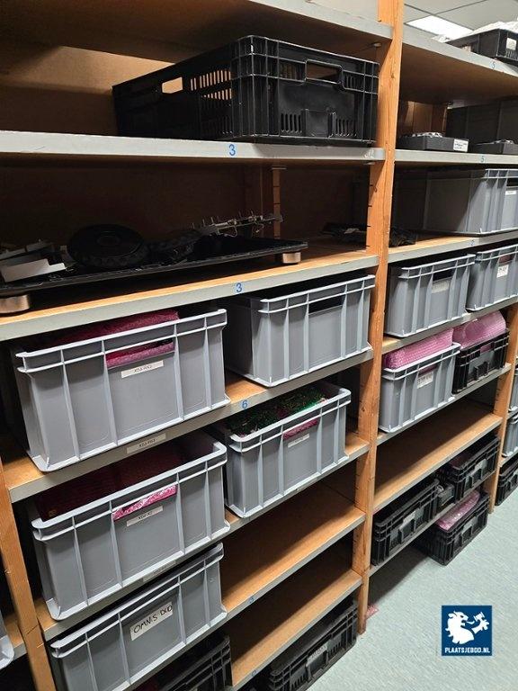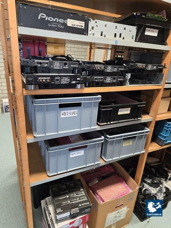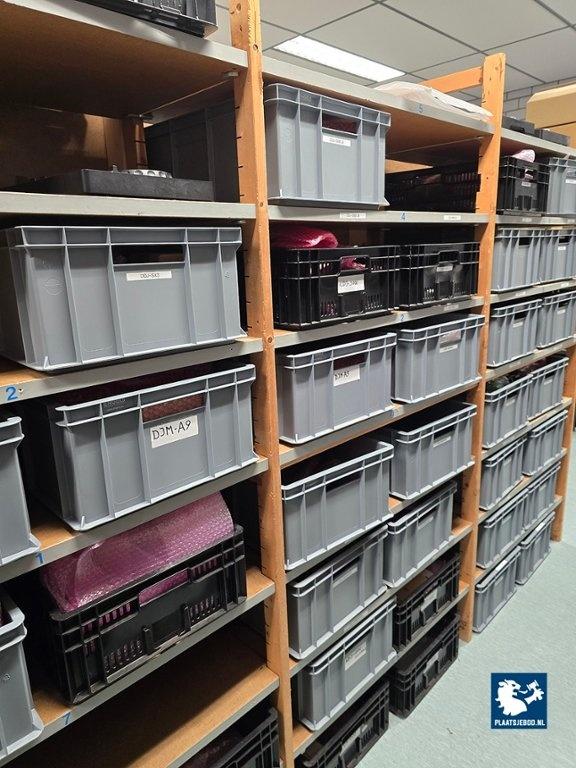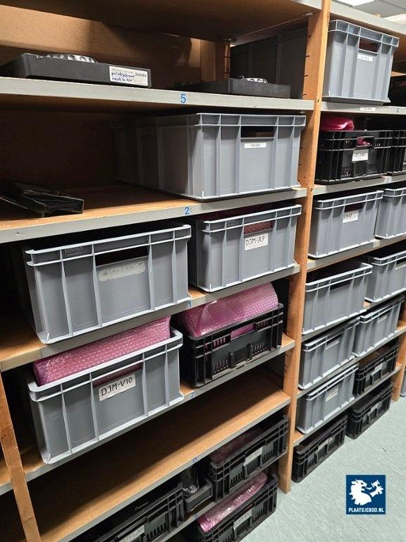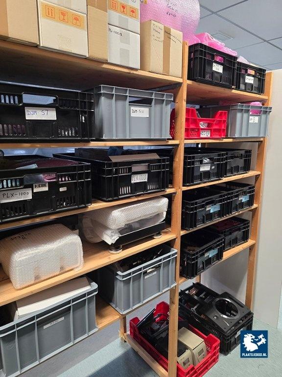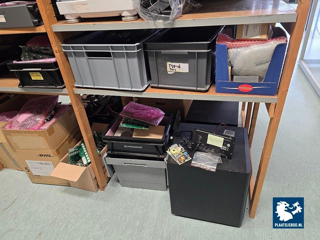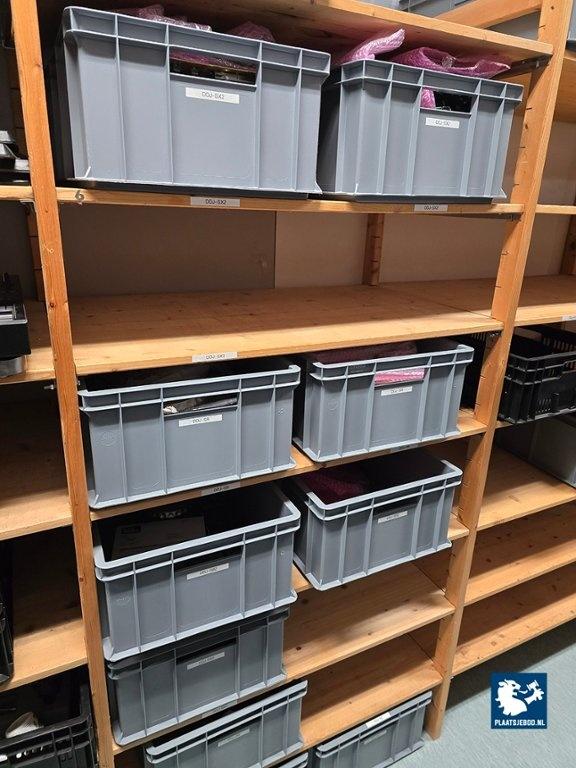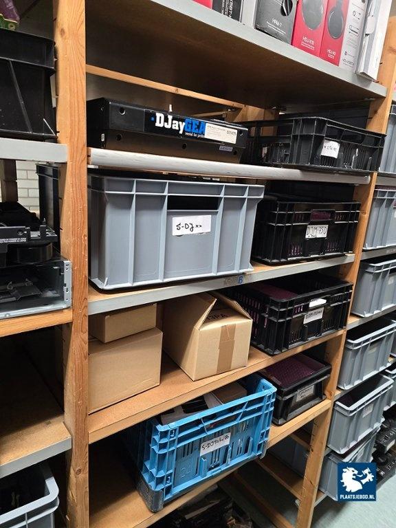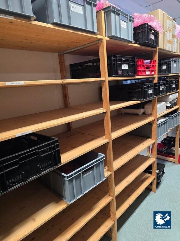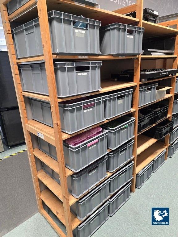 21 x Sectie houten magazijnstelling met diverse inhoud