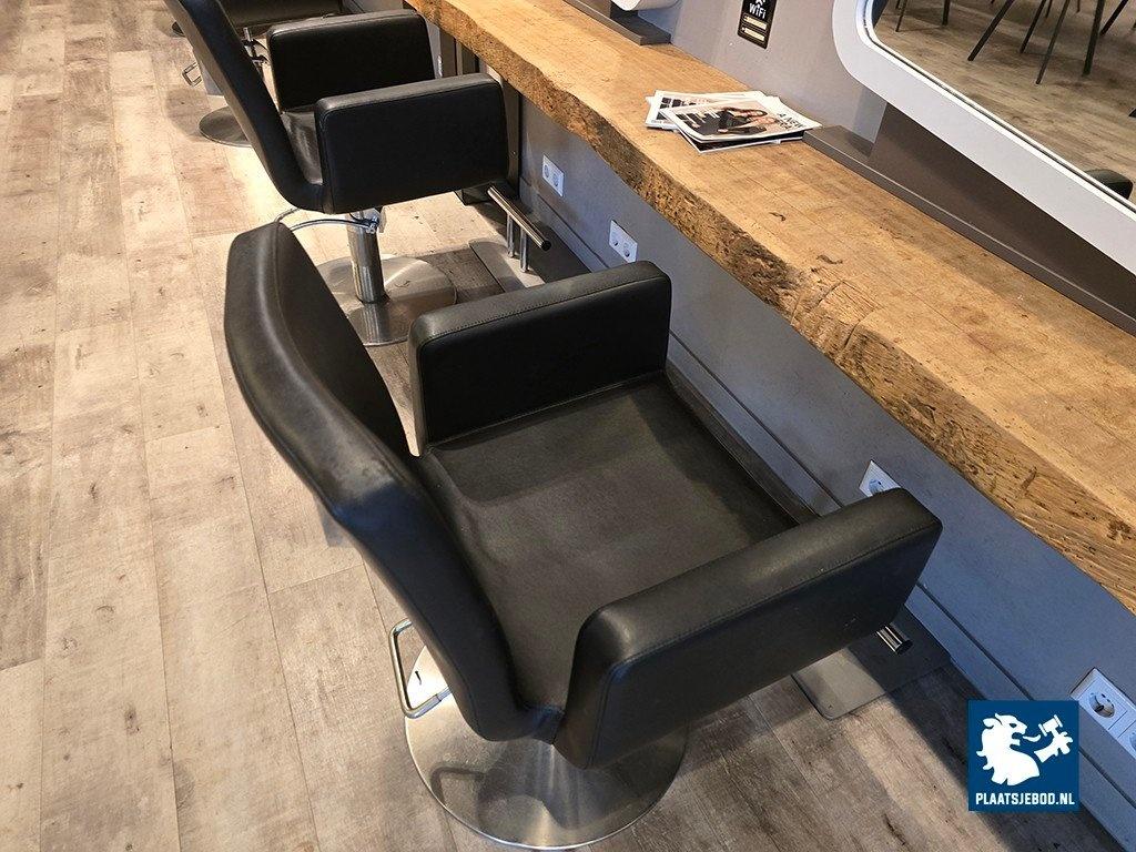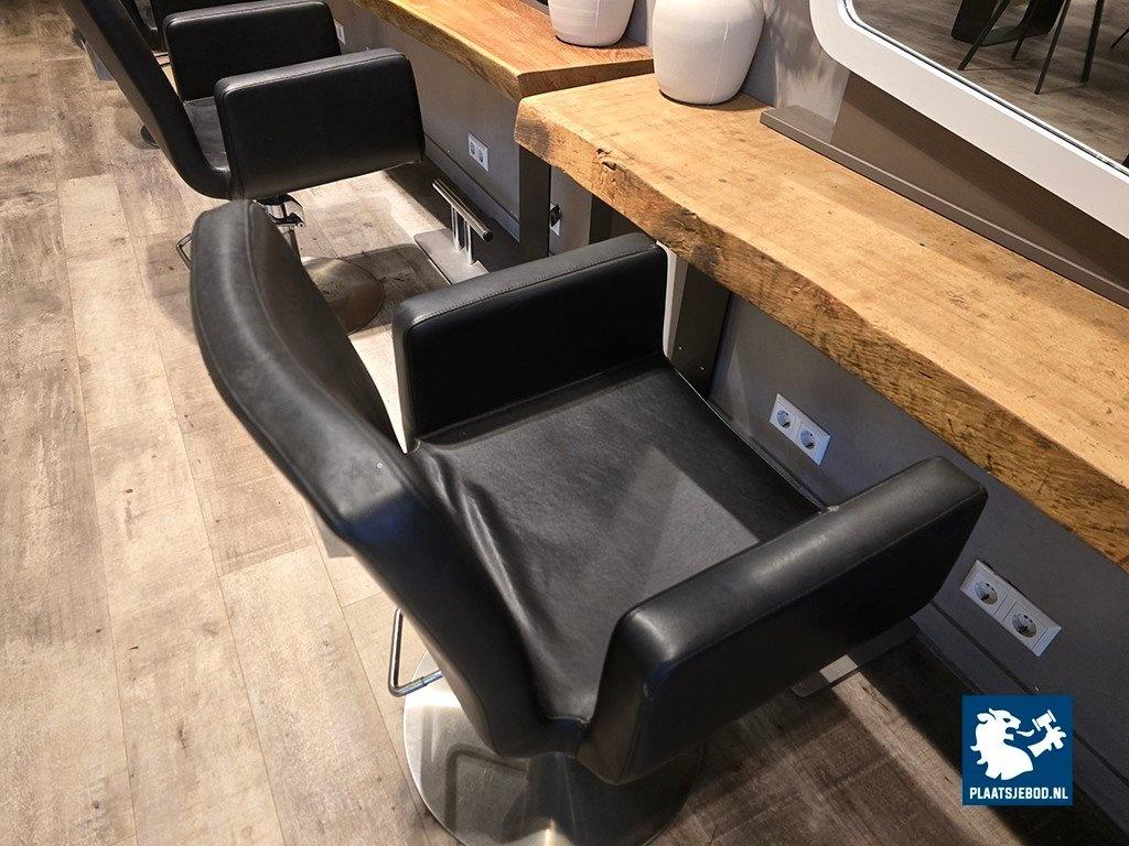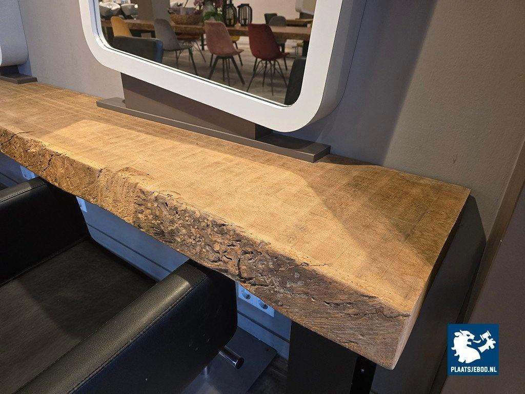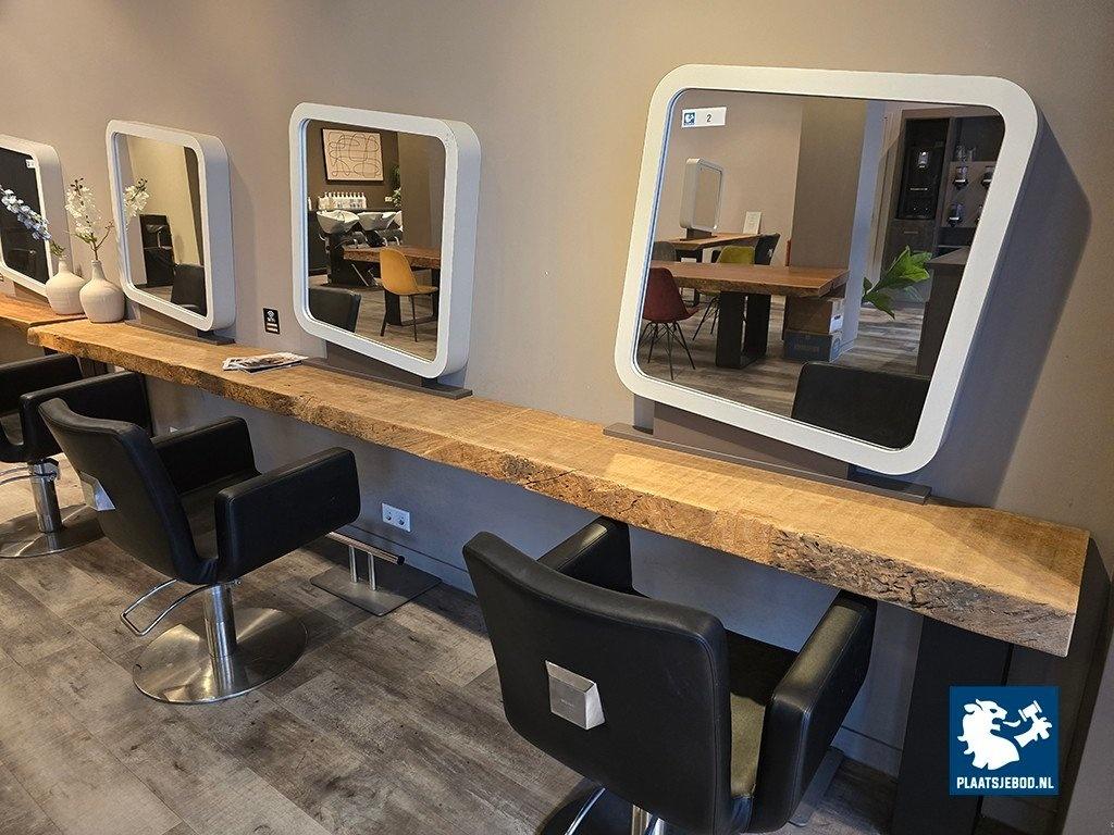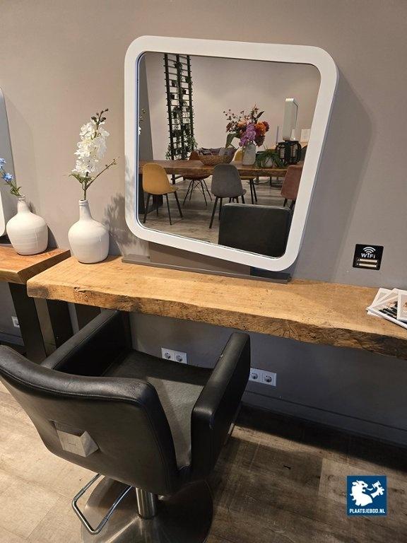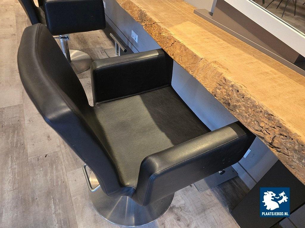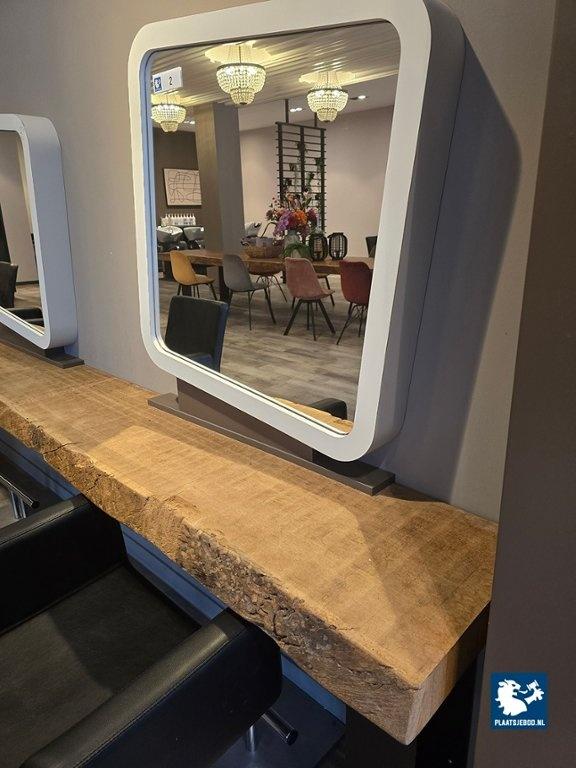 3 x 1-Zijdige kappersspiegel ca. 80 x 80 cm op boomstamtafel ca 420 x 40 cm, voetsteunen en 3 x hydraulisch voetbediende Sibel kappersstoel