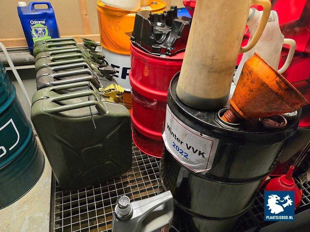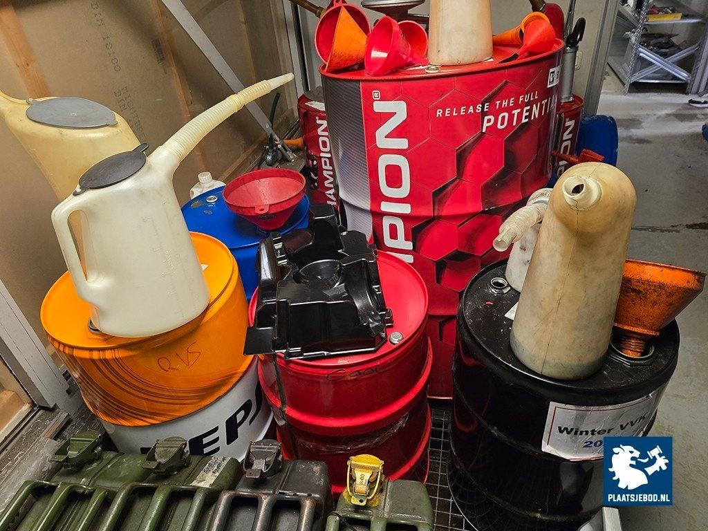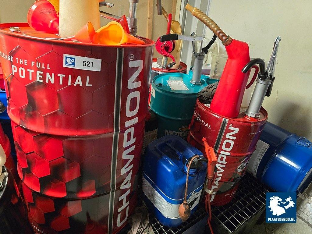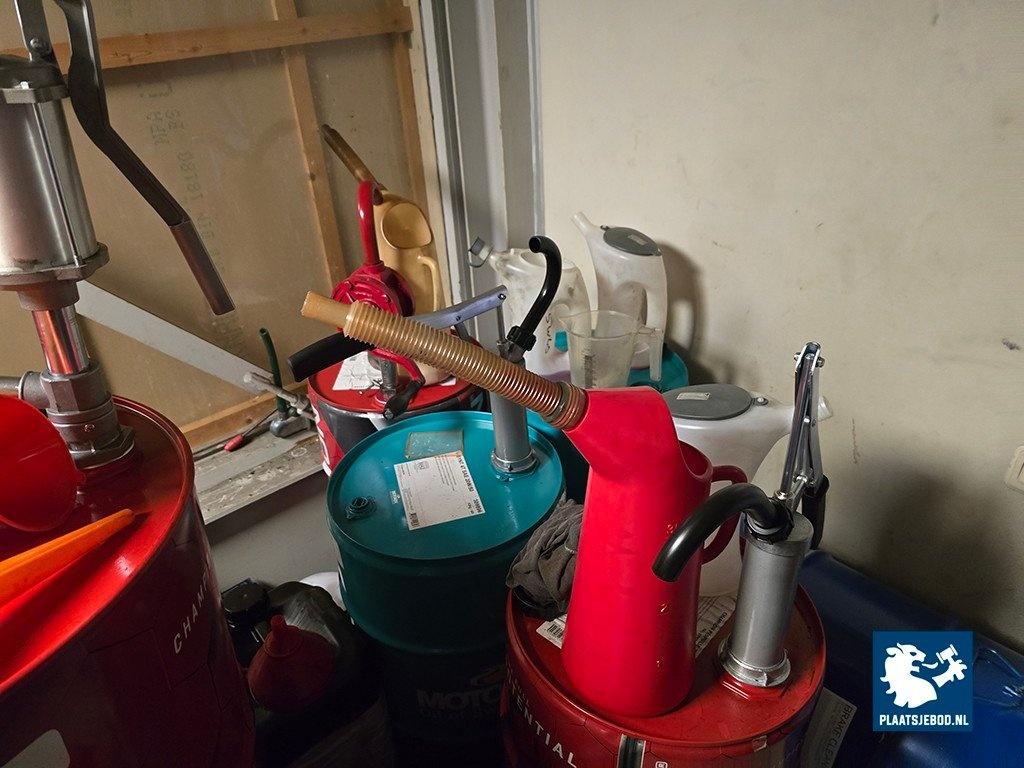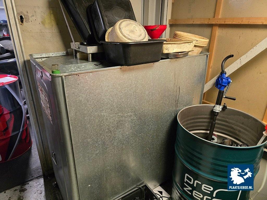 3 x Roosterlekbak met diverse vaten olie, 5 x vatenpomp, etc.
