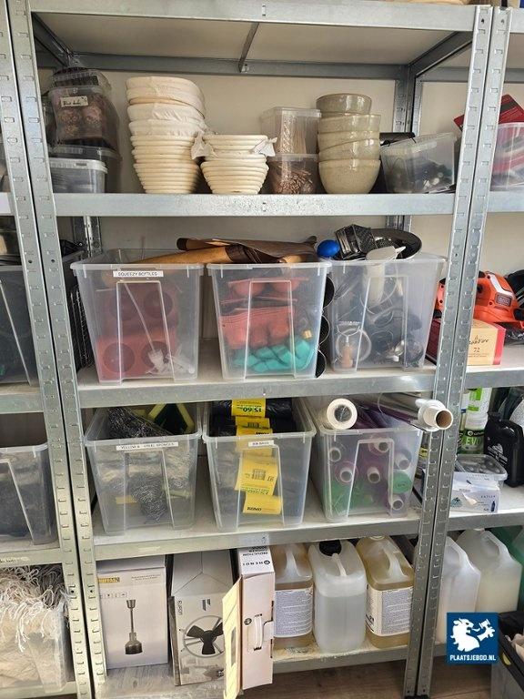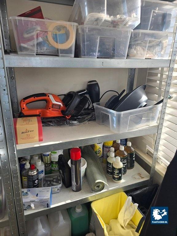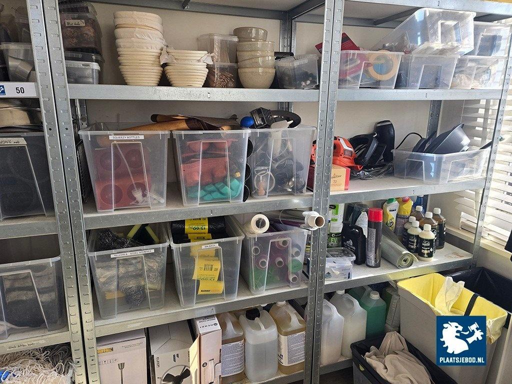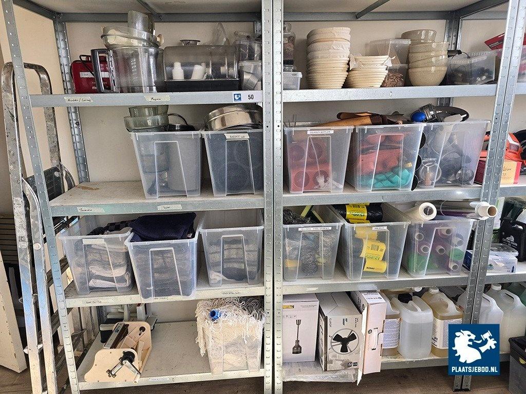 3 x Sectie wandstelling ca. 90 x 40 x 175 met diverse inhoud waaronder disposables, schoonmaakartikelen, bakspullen, etc.
