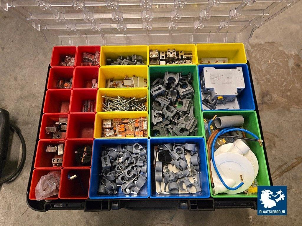 4 x Assortimentskoffer met inhoud waaronder diverse ijzerwaren en elektrotechnisch materiaal