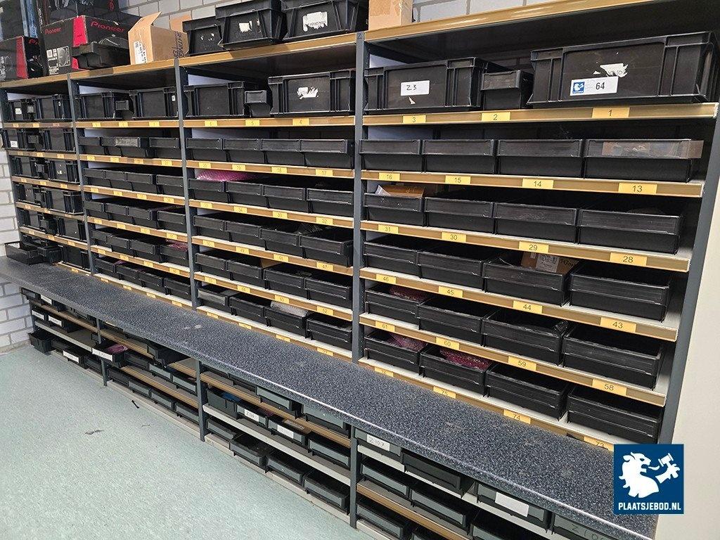 4 x Sectie stelling met ca. 140 diverse kunststof bakken met inhoud