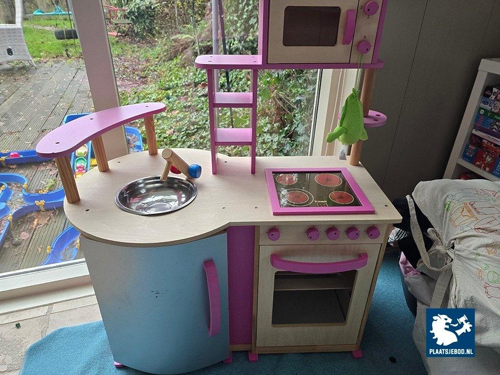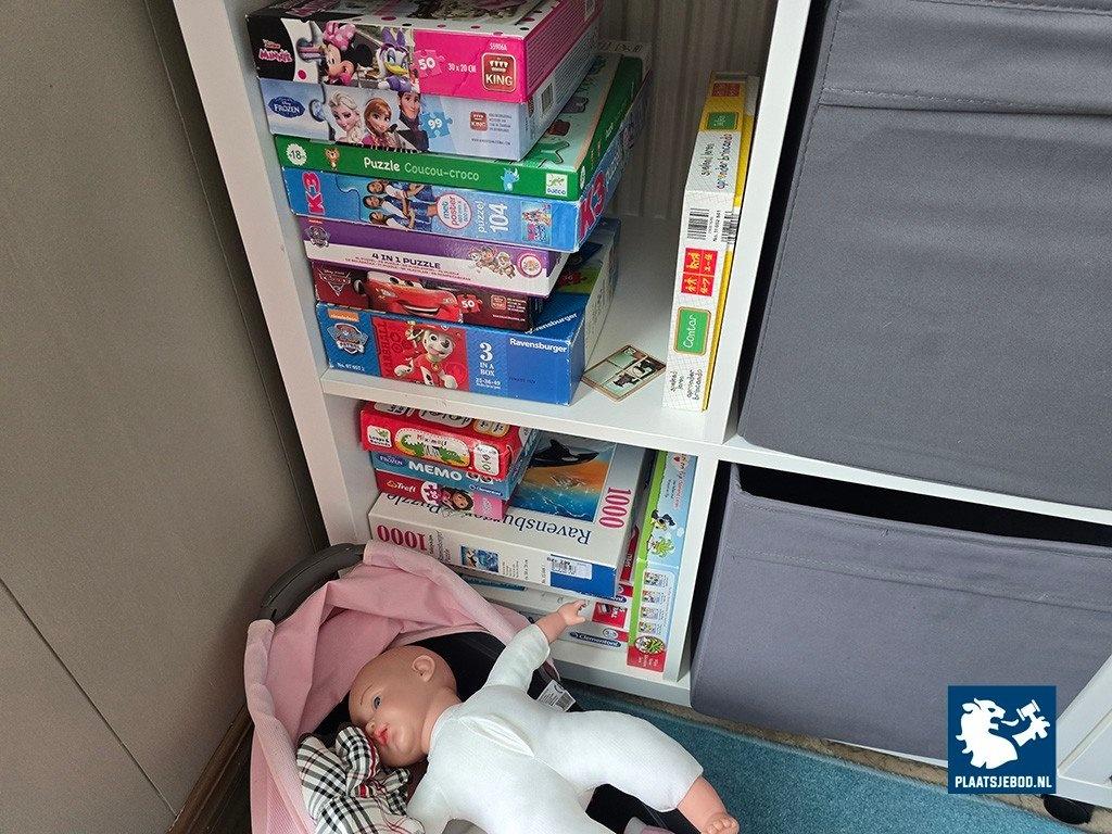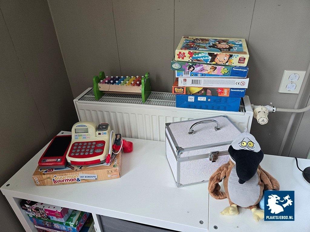 4 x Vakkenkast waarvan 2 x verrijdbaar ca. 76 x 39 x 79, tafel, stoel, speelkeuken, diverse spellen en puzzels, etc.