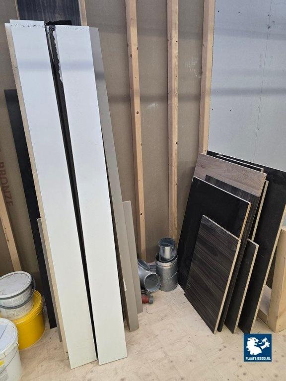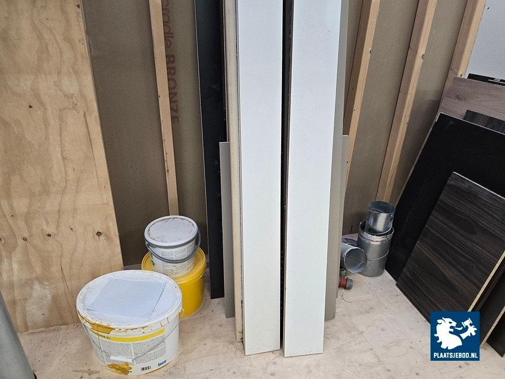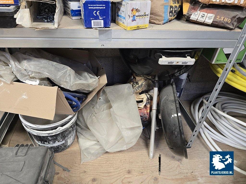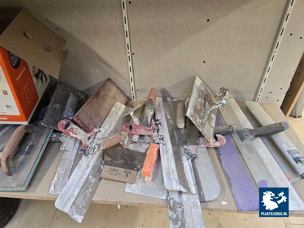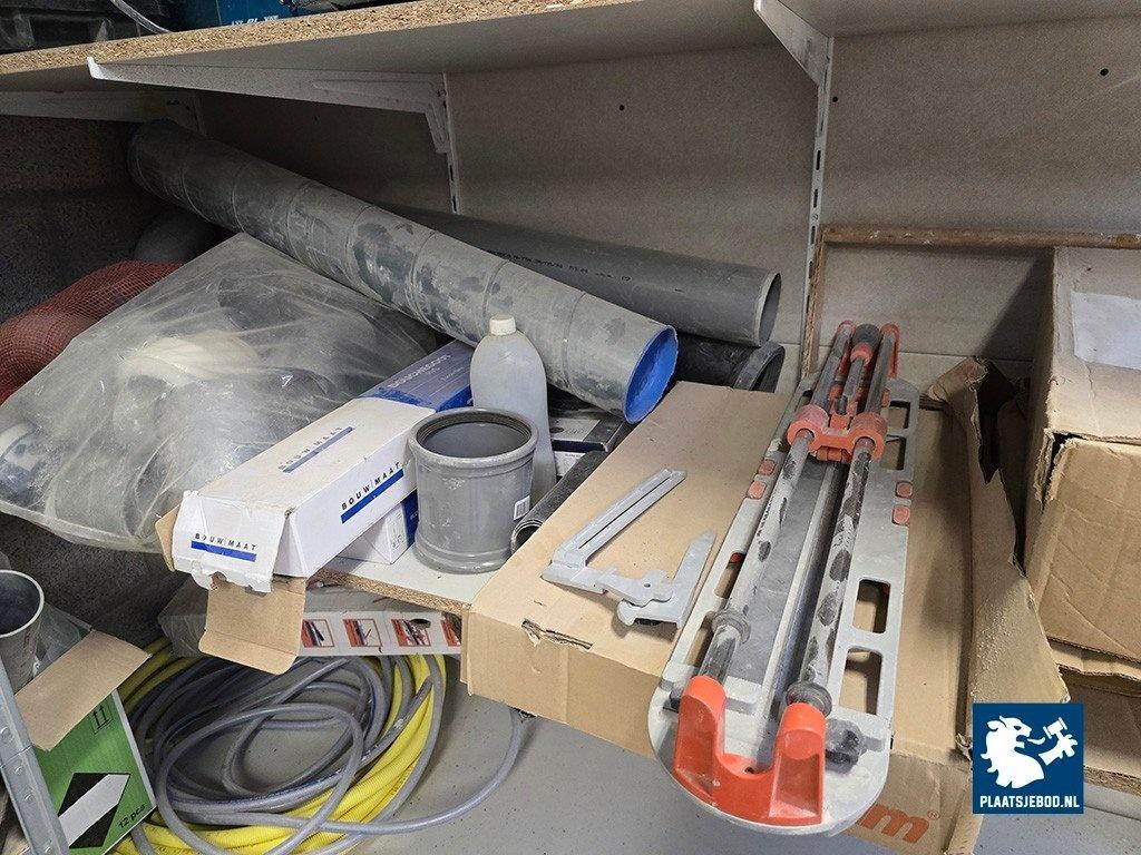 4 x Wandstelling met diverse inhoud waaronder stukadoors gereedschap, centrale luchtafzuiger, Uponor leiding, tegelsnijder, Weber BBQ, etc. Let op; de koper betaalt € 300,- borg t.b.v. een bezemschone oplevering, deze ontvangt de koper geheel retour bij een nette oplevering.