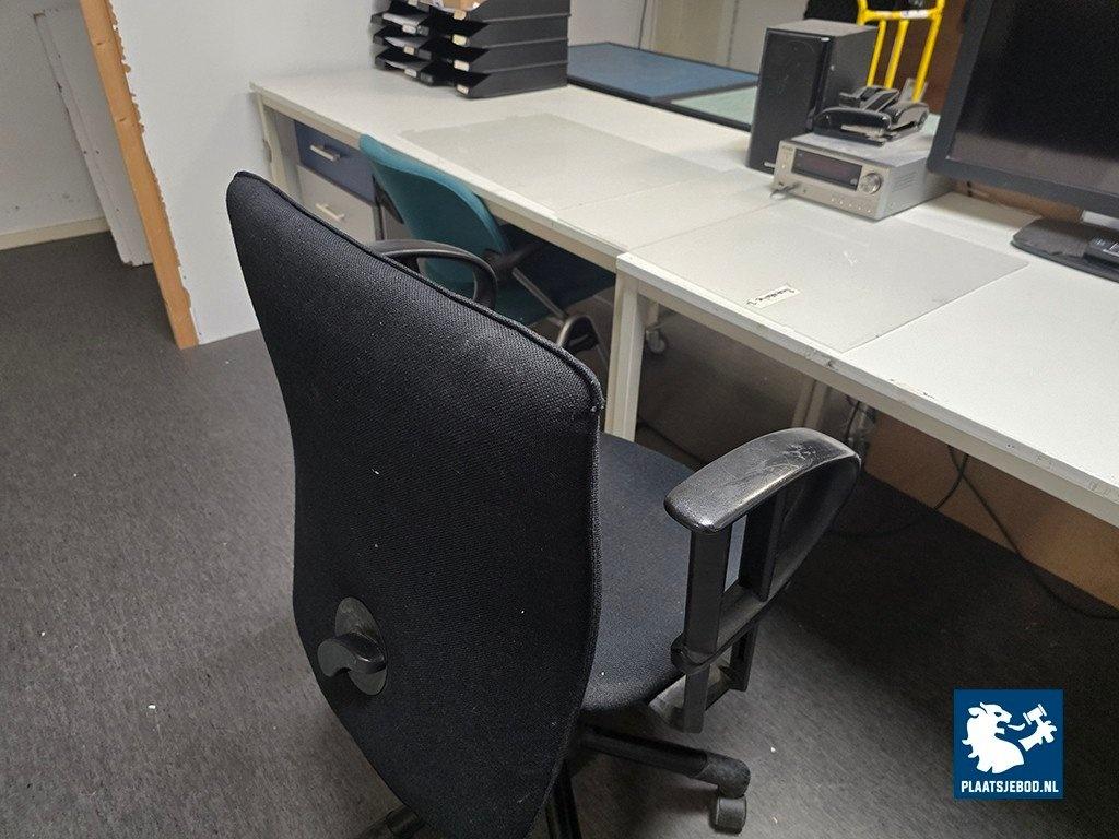 5 x Bureau met stalen frame ca. 150 x 75 cm en 2 x stoel waarvan 1 x verrijdbaar met armleggers
