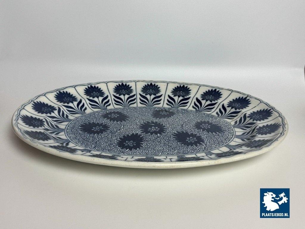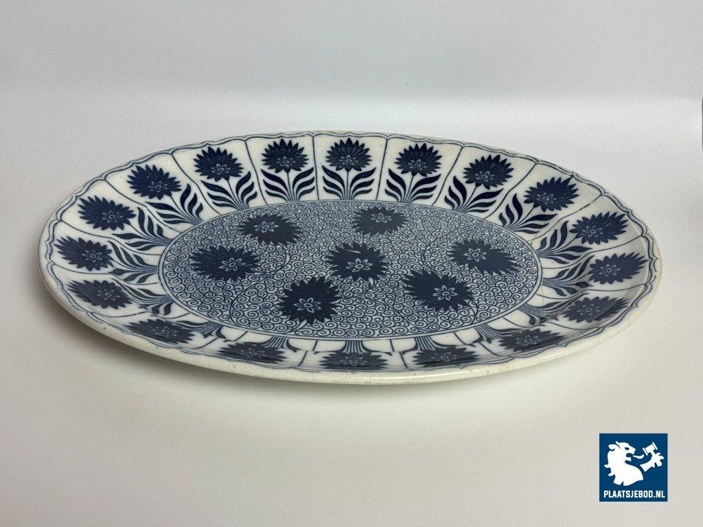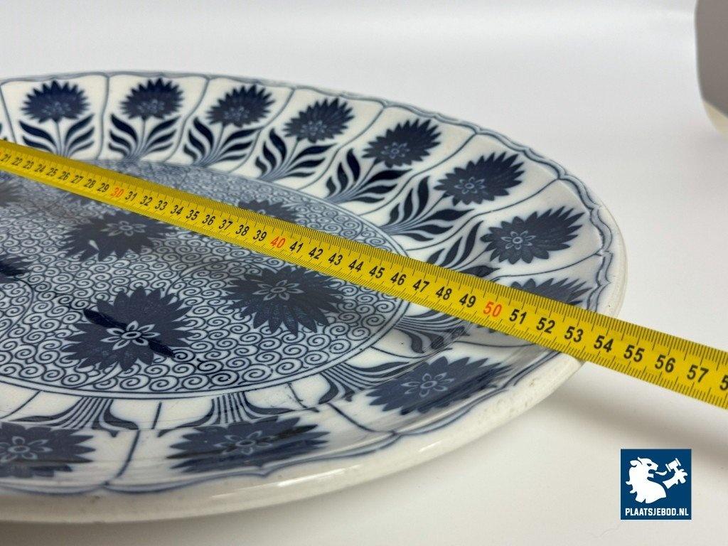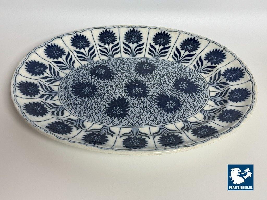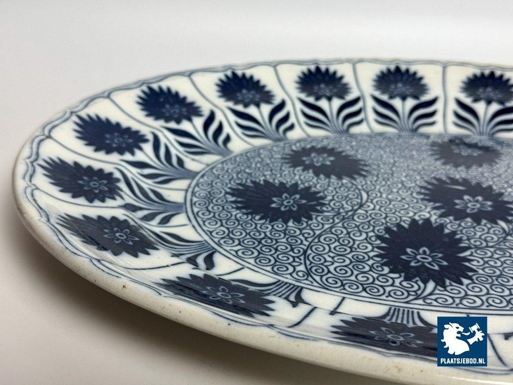 Exceptional large oval porcelain serving platter in the China Aster pattern, produced by Minton, England, late 19th century. This branded platter is decorated in rich cobalt blue on a white ground using transferware, featuring stylised floral motifs arranged rhythmically along the rim and central field. The platter is notable for its monumental size and refined Victorian ornament, reflecting Minton’s high standards in decorative tableware intended for both domestic use and formal presentation. Condition: No visual damage, stable hairline crack, not through; structurally sound with age-related wear. Founded in Stoke-on-Trent, Minton was one of England’s most prestigious porcelain manufacturers. The China Aster pattern belongs to Minton’s late-Victorian production, combining fashionable East Asian–inspired floral design with industrially advanced transfer printing. Large-format serving pieces like this were produced in smaller numbers and are especially sought after today. Dimensions: Length 53 Width 42 Height 4,5 cm.