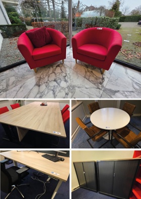 1 x Partij diverse kantoorinventaris waaronder rode fauteuils, ca. 200 cm. Roll-up banner systeem, diverse (elektrische) bureaus ca. 200 x 100 cm, 2 x ladekast, bordestrap, etc.