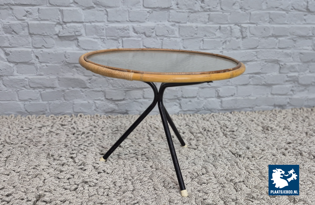 Decorative round vintage bamboo side table with a woven bamboo rim and a clouded translucent glass top, set on a black lacquered metal tripod base with characteristic white-tipped feet. The combination of natural bamboo, soft glass and the graphic metal frame gives this table a light and elegant mid-century modern appearance. A simple yet charming accent piece, ideal as a side table, plant stand or occasional table.