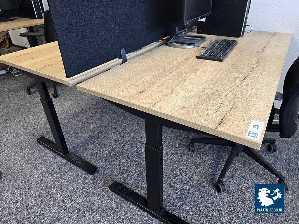 5 x In hoogte verstelbare bureau's met reprohouten bladen en akoestische scheidingswanden
