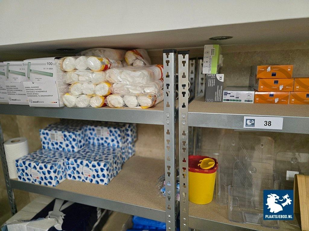 Kavel 233-038: 5 x sectie magazijnstelling met inhoud w.o. voorraad schoonmaakartikelen, scheermesjes, wattenschijfjes, luchtbehendelunits, stoelen, krukken, etc.