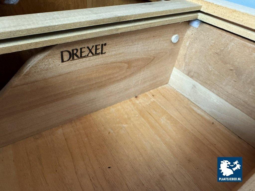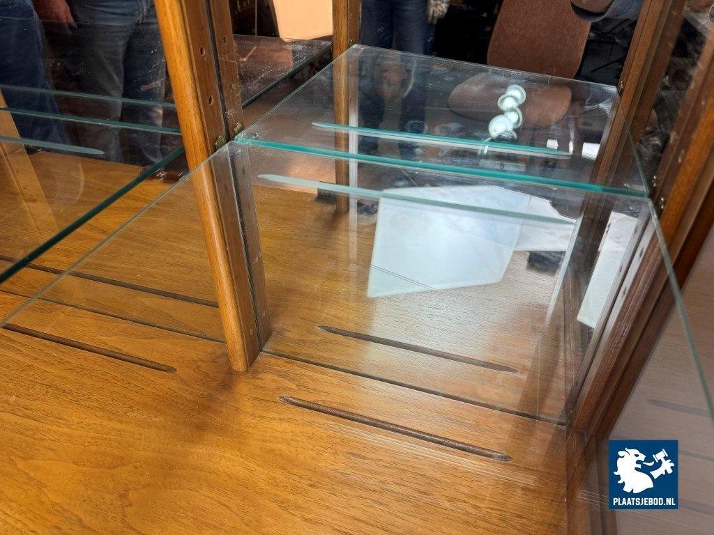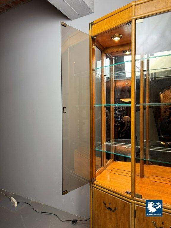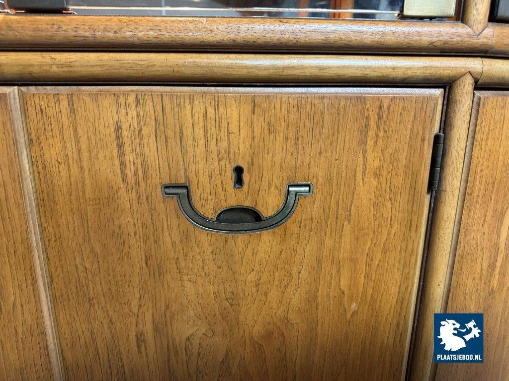 Impressive Mid-Century Drexel Illuminated Vitrine Cabinet with Refined Integrated Brass Inlaid Hardware, USA 1960s. An exceptional vitrine cabinet by Drexel, distinguished by its refined craftsmanship and architectural presence. The cabinet features an illuminated display interior with transparent doors and shelving, an internal drawer, and finely integrated brass inlaid handles set flush into the woodwork. Rising to over 200 cm in height, the piece exemplifies Drexel's mastery of precision finishing, functional elegance, and enduring quality. Dimensions: Height 207 (70 + 137) cm, Width 153 cm, Depth 42 cm