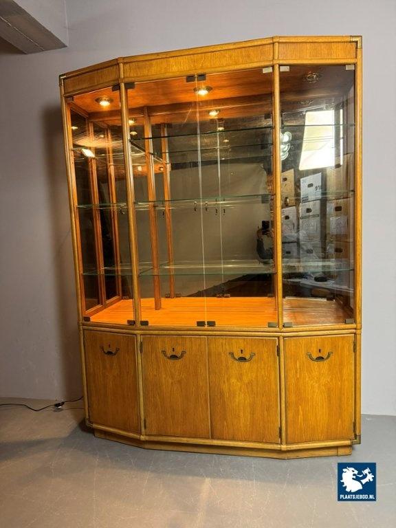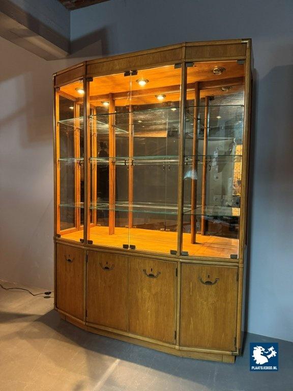 Kavel 311-041-ST059-B3: Exceptional Mid-Century Drexel Illuminated Vitrine Cabinet with Refined Integrated Brass Inlaid Hardware, USA 1960s.