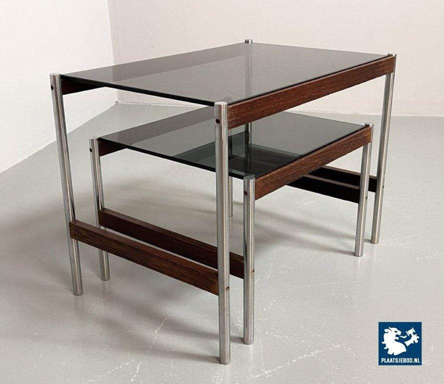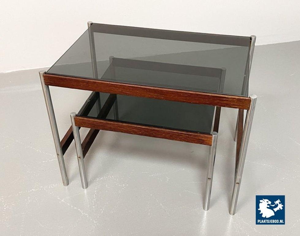 Set of 2 Dutch design nesting tables with smokey glass top on wenge with chrome frame. Manufactured with great craftsmanship and quality by Fristho, The Netherlands in the 1960s. It’s a timeless design that matches with any interior. The set is in well preserved vintage condition with some wear consistent its age and use. Minimalistic modern elegant mid-century design from the Netherlands, Dimensions: Height: 40 - 28 cm, Width: 53 - 40 cm, Depth: 35,5 - 35,5 cm, Quantity: 1 set