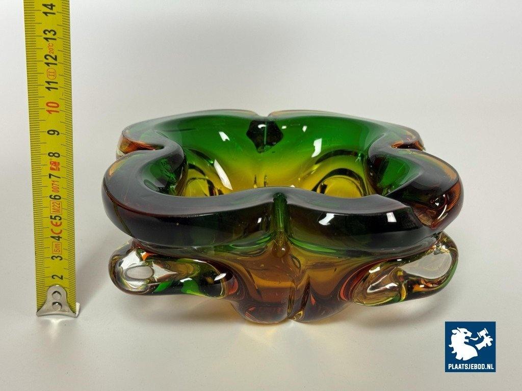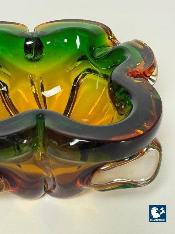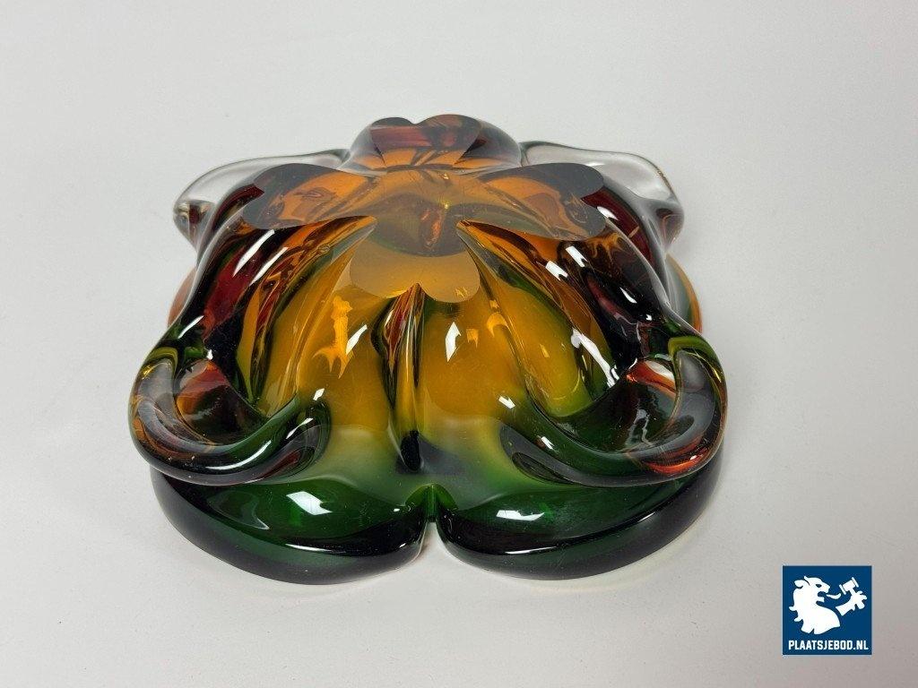 Vintage Brutalist Organic Murano Glass Bowl, Italy 1960s. A striking Murano glass bowl/ashtray featuring a vivid gradient from green to amber-brown. It's sculptural biomorphic silhouette is accented by four deep notches that function as cigarette rests or bod decorative contours. It reflects the region's renowned glassmaking tradition while leaning into an almost brutalist aesthetic through its weighty form and expressive folds. The glass shows characteristics associated with Murano production, including rich color saturation, heavy weight, smooth hand-finished edges and an organic free-form design typical of mid-century Italian decorative glass. This piece of glass art is in an excellent preserved condition; no chips or cracks observed. Dimensions: Height 7 Width 17 Depth 17 cm.