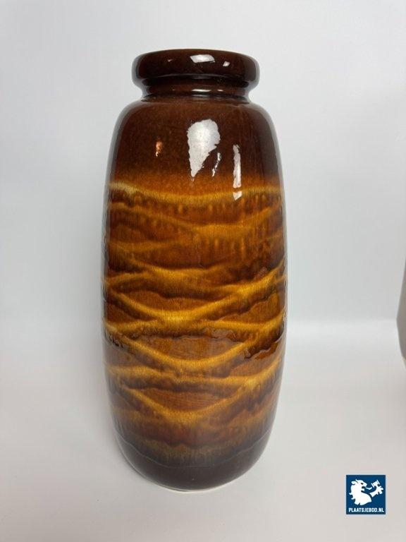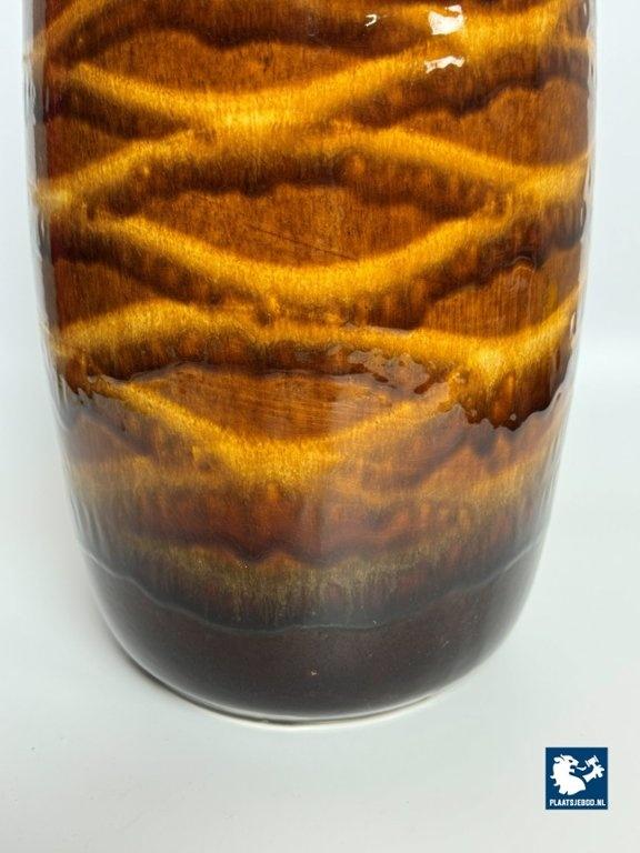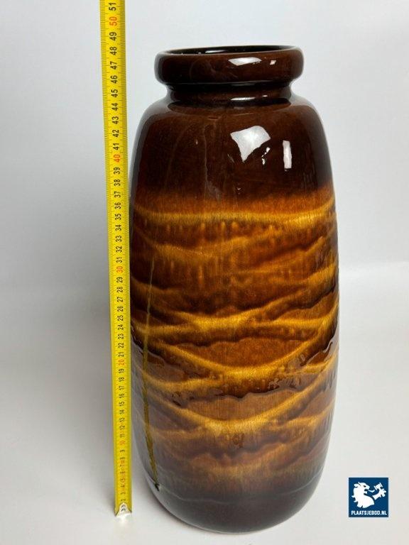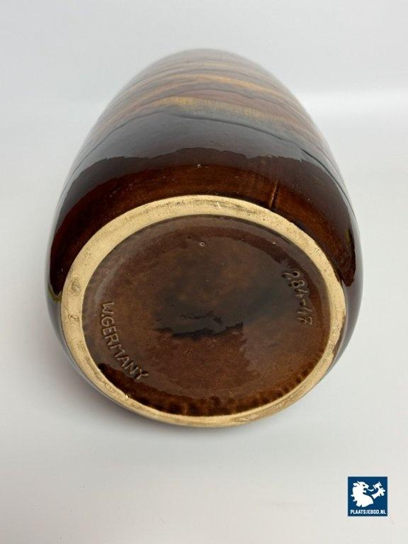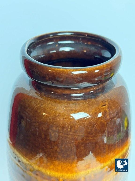 This large ceramic vase, model 284/47 was produced in West Germany during the 1970s and features a tall, sculptural form with a richly glazed high-gloss surface in warm chocolate brown and golden tones. The flowing, layered glaze pattern creates depth and subtle movement, giving the vase a refined yet bold presence. Its elongated shape and lustrous finish make it a strong decorative object and a fine example of classic West German pottery. The vase is in very good vintage condition. Dimensions: Height 47 Diameters: Top 12,5 Opening 10 Belly 22 cm