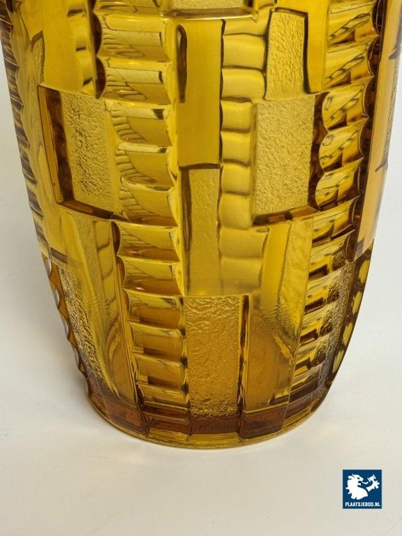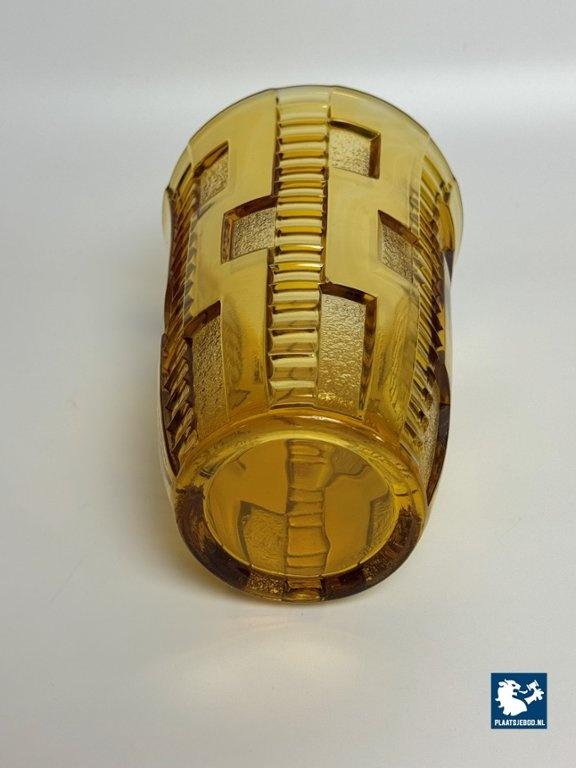 This amber glass vase is the Marceau model from the Luxval collection by Val Saint Lambert, produced in Belgium during the 1930s–1940s and standing 21 cm high. The vase is made of transparent amber glass and features a bold geometric relief pattern with strong vertical articulation, characteristic of Luxval pressed glass design. The warm colour and crisp texture give the vase a striking architectural presence while remaining elegant and highly decorative. A classic example of Belgian Art Deco–influenced glass design. The vase is in excellent vintage condition. Dimensions: Height 21 Diameters: Top 14,5 Belly 8,5 cm