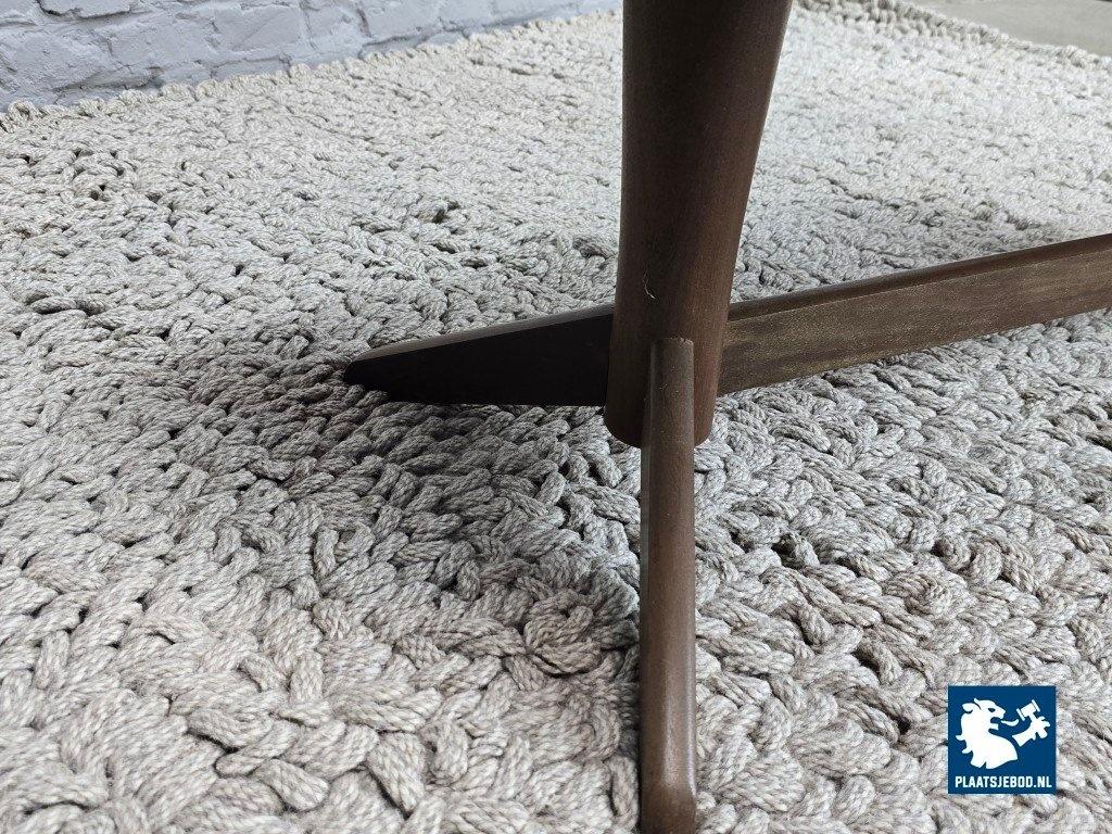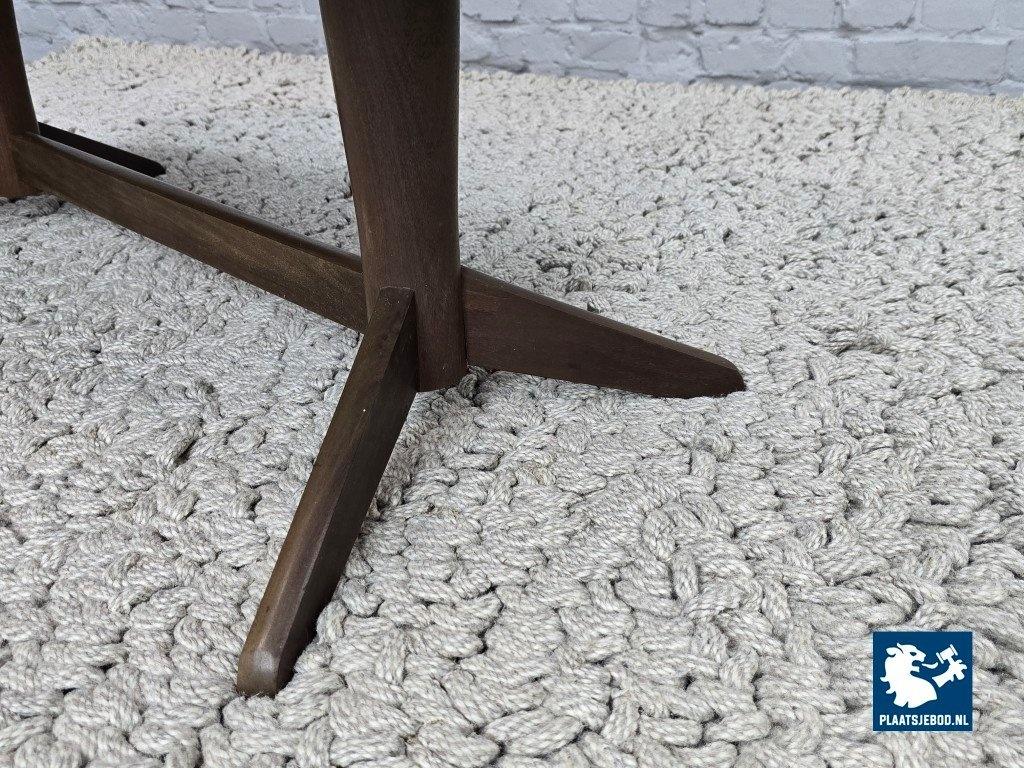 The table is supported by a bold pedestal base crafted from solid wood, with elegantly angled legs that display the organic, architectural language characteristic of mid-century Danish design. The harmonious balance between the substantial top and the sculptural base creates a powerful yet refined silhouette.