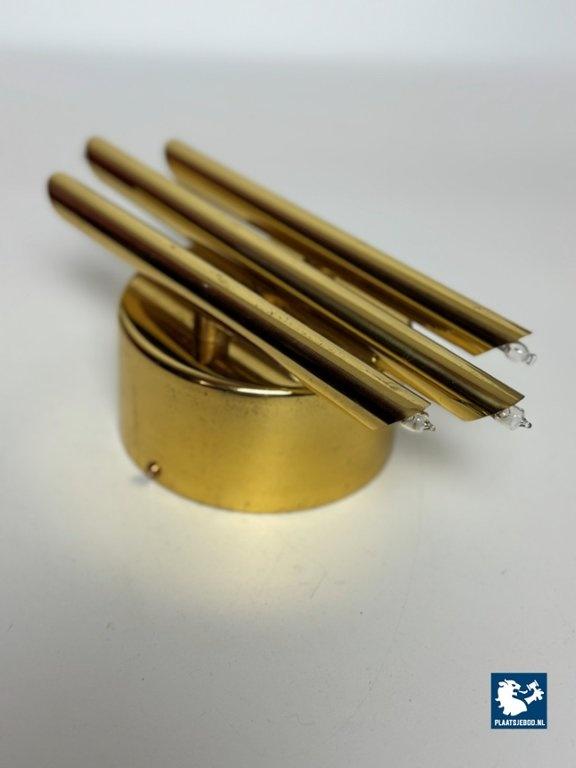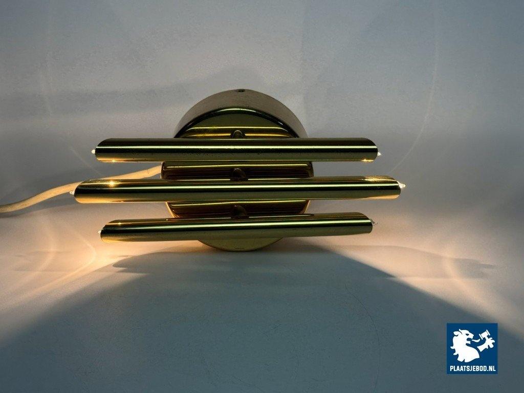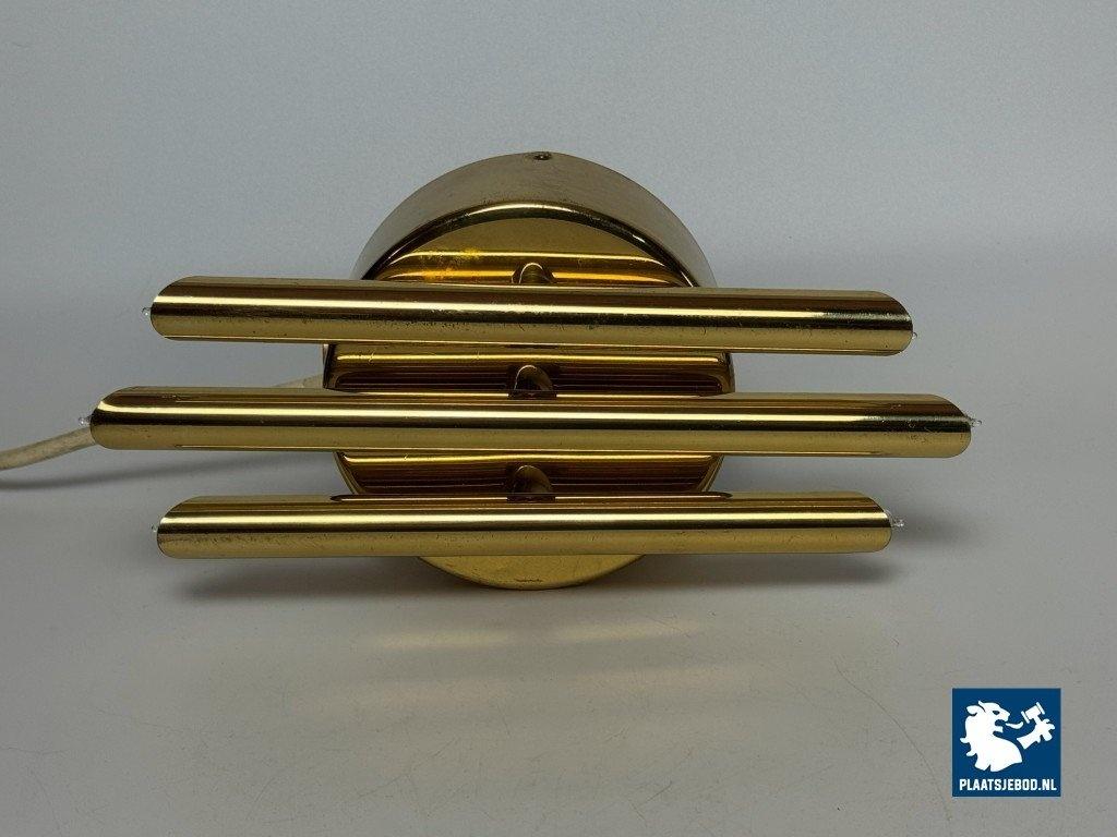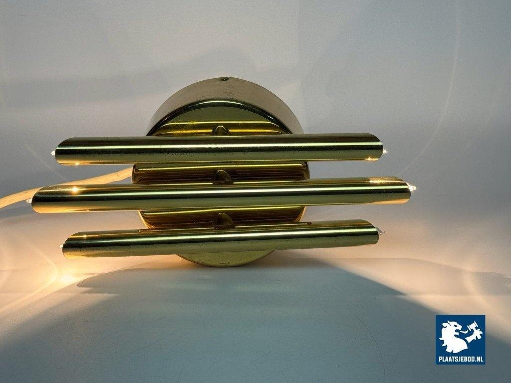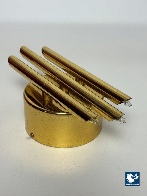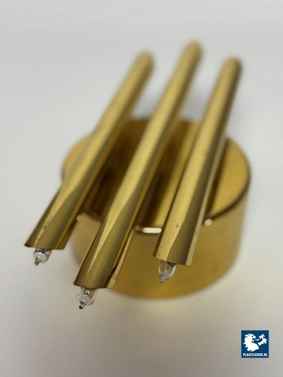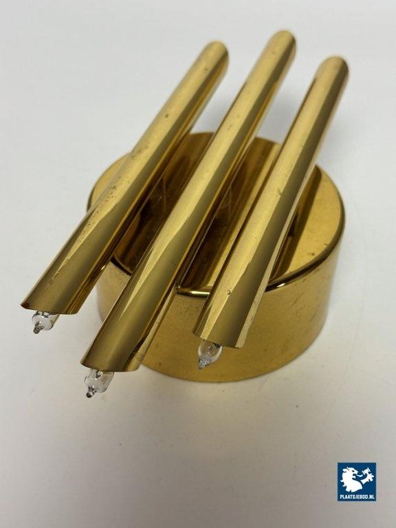 This striking wall sconce was produced by Sölken Leuchten in Germany during the 1960s and exemplifies the solid craftsmanship and sculptural approach characteristic of mid-century German lighting. The sconce is constructed from heavy brass and consists of three cylindrical brass tubes mounted on a thick, circular backplate. Each tube is fitted with inset bulbs at both ends, creating a balanced and architectural lighting effect. The clean geometry and strong material presence give the lamp a distinctly brutalist yet elegant character. When illuminated, the light is emitted both upwards and downwards, producing a warm, atmospheric glow that enhances walls and architectural surfaces. Thanks to its compact proportions and substantial weight, the lamp functions equally well as a decorative accent or as a statement wall light. A high-quality and timeless design. The wall sconce is in a very well preserved vintage condition. As with all vintage pieces, they may show light signs of use, which add to their authentic character. Dimensions: Height: 28 cm, Width: 14 cm, Depth: 10 cm