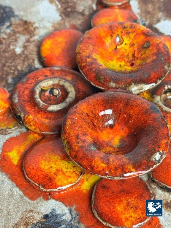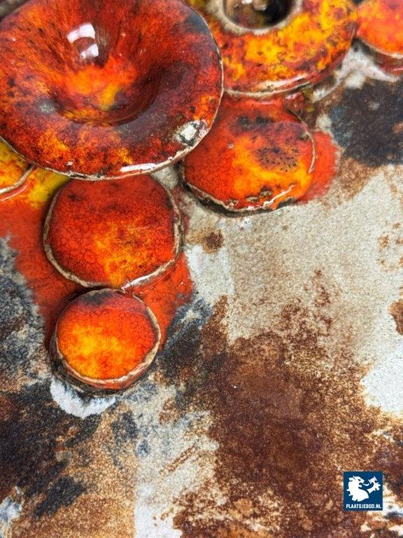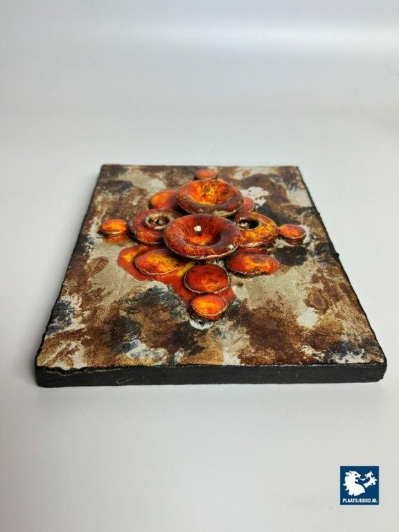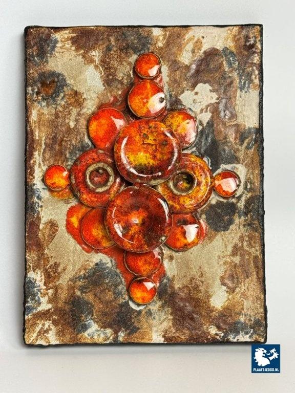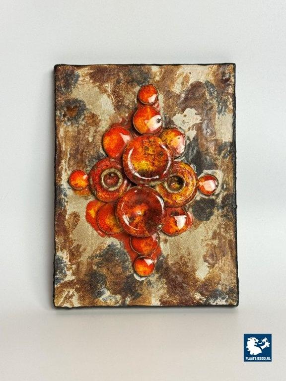 Kavel 311-070-DA-060-PPR: Mid-Century Design Ruscha Wall Tile Handpainted with High gloss orange tones combined with Matte Earth tones enamel. Germany, 1960s.