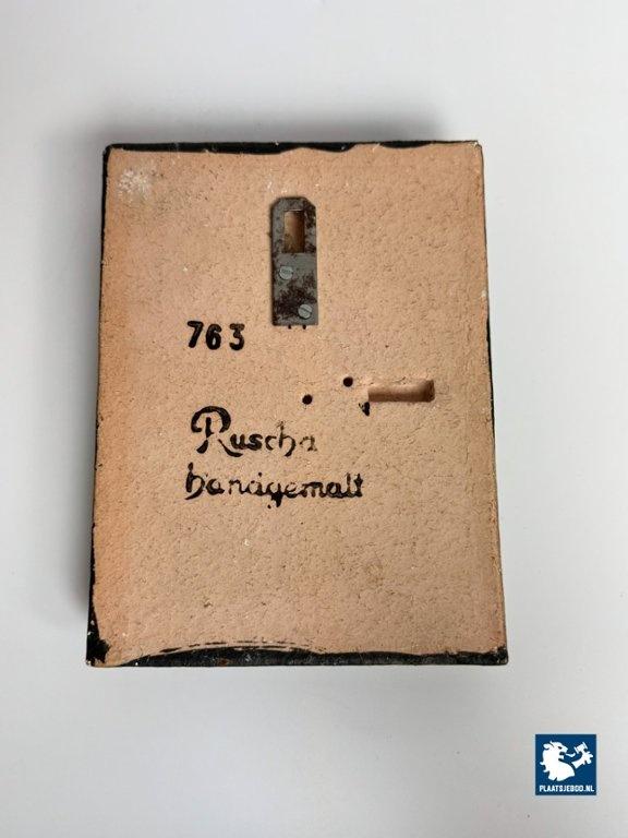 This decorative ceramic wall tile is a classic example of mid-century Ruscha wall design, combining tactile relief with bold glaze contrasts that are instantly recognisable to collectors of West German pottery. The composition centres on a raised abstract floral / cellular motif, built from rounded, bubble-like forms in high-gloss orange and amber enamel. These glossy elements sit in strong contrast against a matte, earth-toned background in mottled brown, beige, and olive hues—creating depth, shadow, and a rich volcanic surface effect reminiscent of Fat Lava aesthetics, though executed here with more precision and gloss. The tile’s relief is pronounced, giving it a sculptural presence despite its compact size. At approximately 3 cm thick, it projects confidently from the wall and works equally well as a standalone accent or as part of a grouped wall installation. The piece is in a very well preserved condition. This piece sits firmly within Ruscha’s decorative wall tile production, valued for its expressive glaze chemistry, strong colour contrast, and architectural relief. The vivid orange enamel—warm, saturated, and reflective—elevates the tile above more subdued examples and makes it especially attractive for collectors and interior designers alike. Dimensions: Height 24 Width 18 Depth 3 cm.