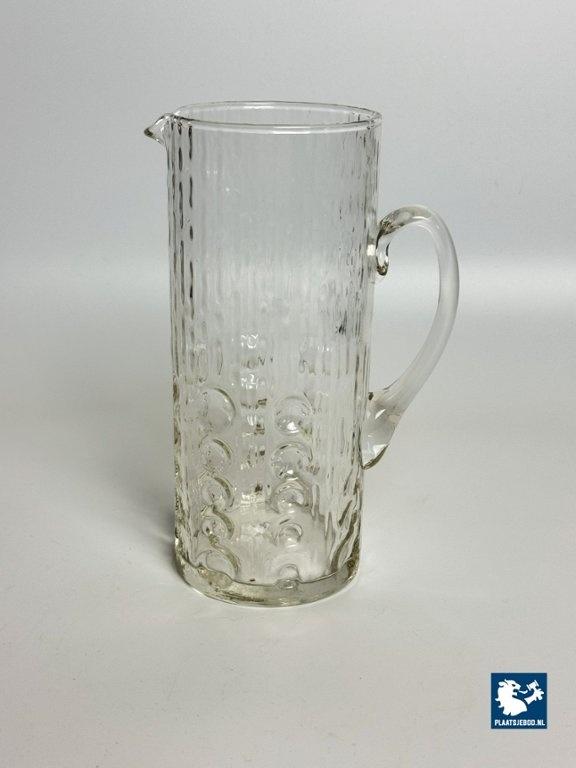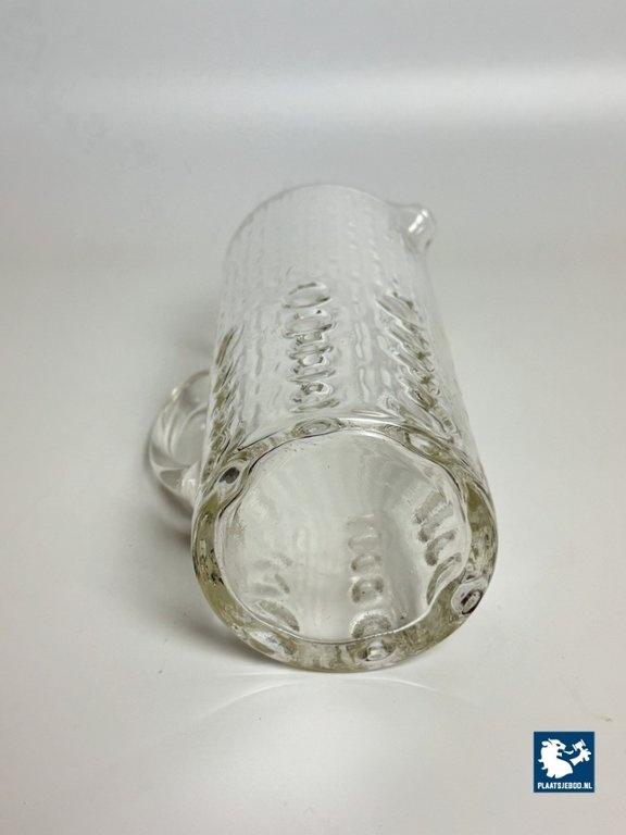 Mid-Century Vintage Swedish Glass Water Jug by Kosta Boda 1970s. The jug has a slender cylindrical form (height 22.5 cm), with an applied clear glass handle and a softly formed pouring spout. The surface is decorated with a tactile relief pattern: vertical striations combined with rounded, bubble-like impressions concentrated toward the lower section, creating depth and a lively interaction with light. The jug is in a very well preserved vintage condition. A strong example of Scandinavian modern glassware where functionality and subtle sculptural surface design are combined. Kosta Boda is one of Sweden’s most prestigious glass manufacturers, originating from the Kosta glassworks founded in 1742, later merged with Boda Glasbruk. During the 1960s and 1970s, Kosta Boda became internationally known for modern, textural glass design intended for everyday use as well as artistic expression. Pieces from this period are valued for their durability, clarity of form, and characteristic Scandinavian restraint. Dimensions: Height 22,5 |Diameter 9,3 cm