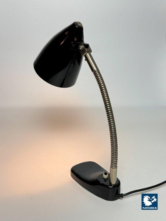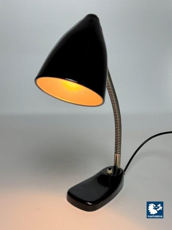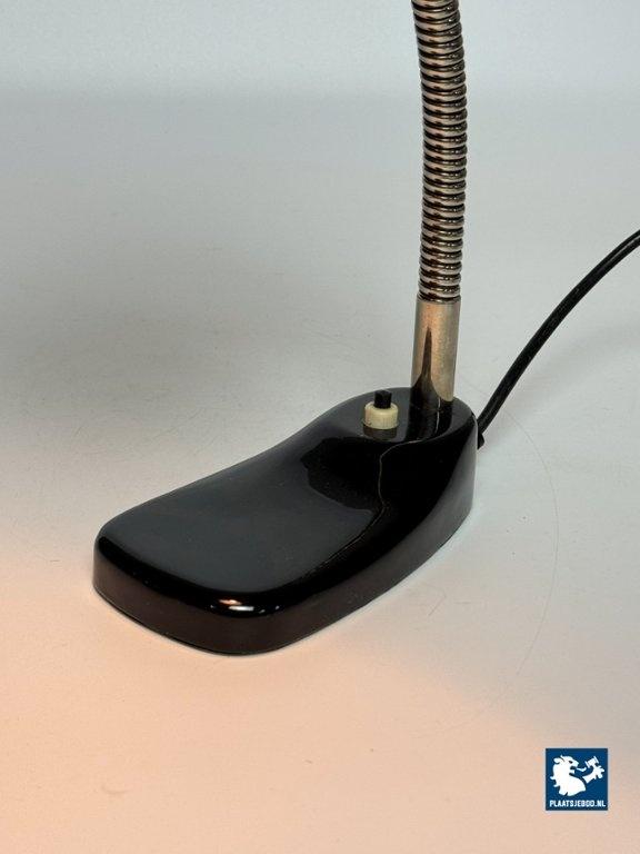 This elegant mid-century desk lamp was produced by Hala in The Netherlands during the 1960s and represents a classic example of functional Dutch lighting design. Finished in glossy black lacquer, the lamp features a beautifully shaped metal shade mounted on a flexible, chrome-plated gooseneck stem, allowing the light to be directed precisely where needed. The compact base enhances its practicality, while the refined proportions give the lamp a timeless, understated presence. Designed as a work and reading light, this model combines durability with elegance, reflecting Hala’s reputation for high-quality industrial production. Its minimalist design fits seamlessly into both mid-century and contemporary interiors. A well-preserved and highly usable vintage desk lamp with strong character and enduring appeal. The lamp is in excellent vintage condition and appears exceptionally well preserved. The black lacquered surfaces are clean and glossy, with minimal to no signs of wear. The chrome gooseneck is bright and intact. Overall, the lamp presents almost as if it were newly produced, while remaining entirely original. Dimensions: Height: 40 cm, Depth: 22 cm, Diameter shade: 12 cm