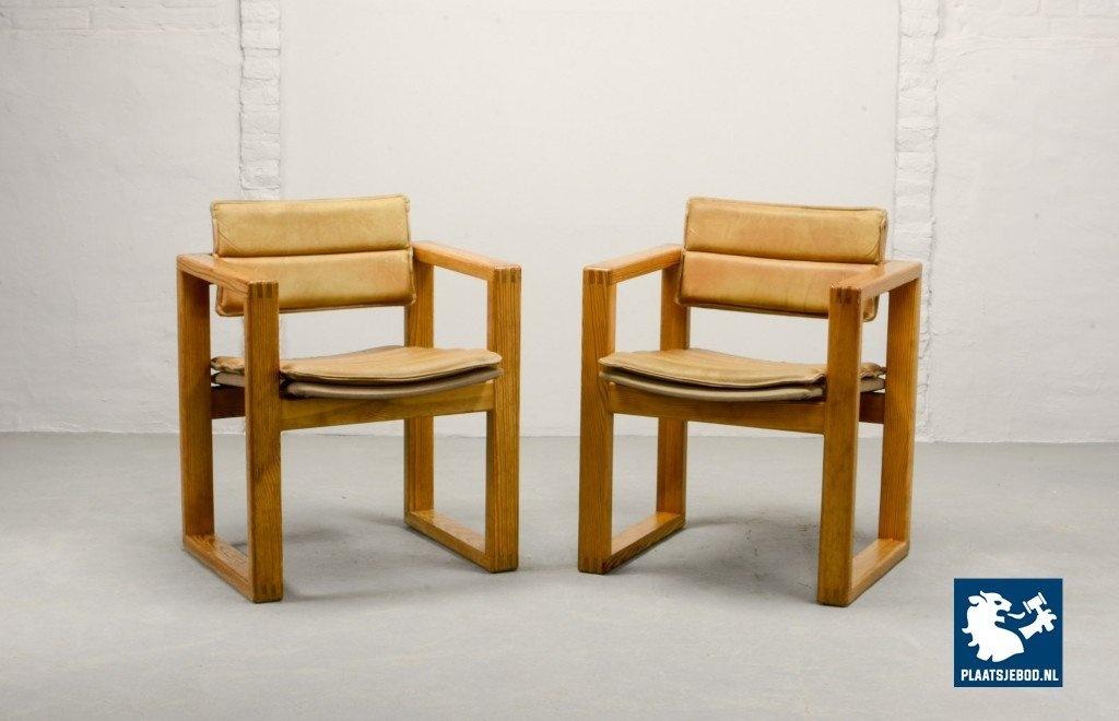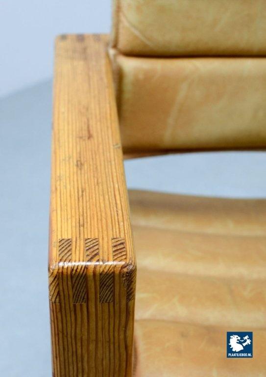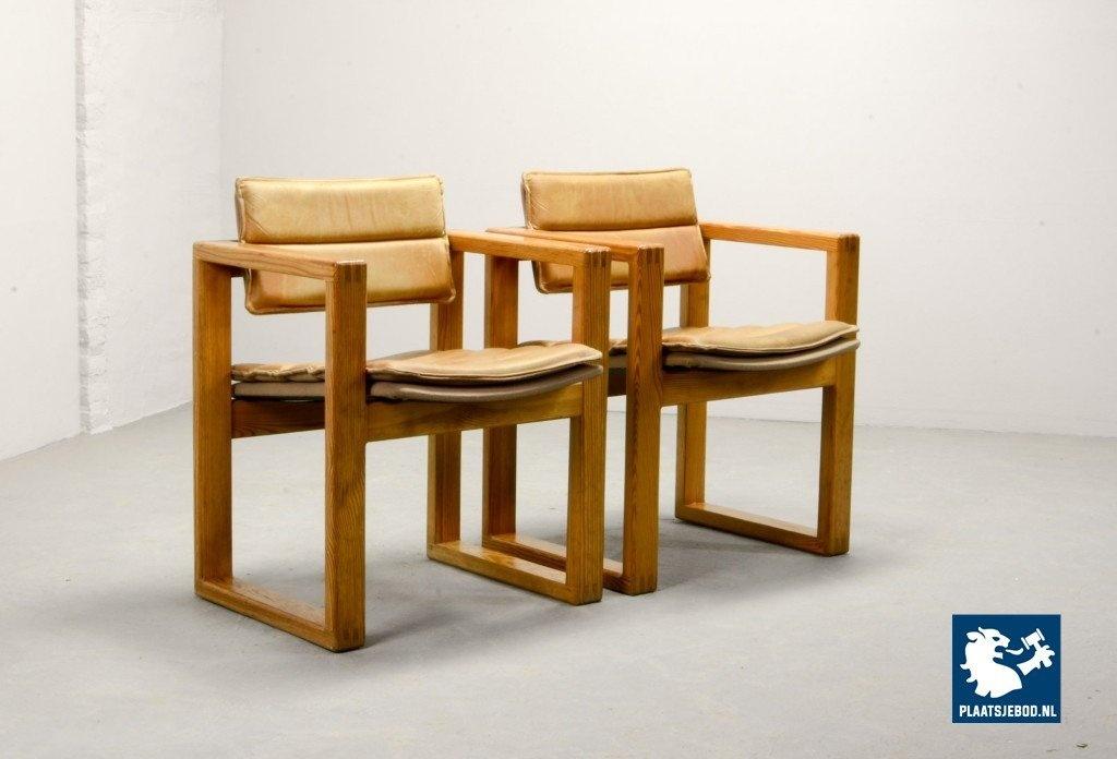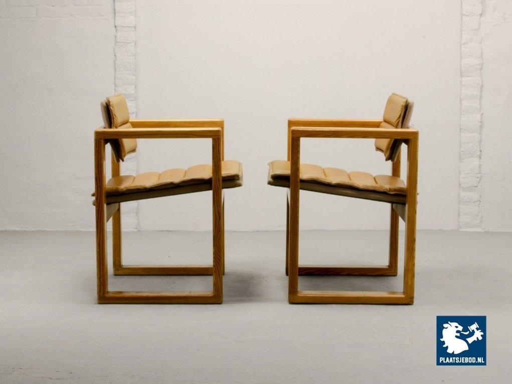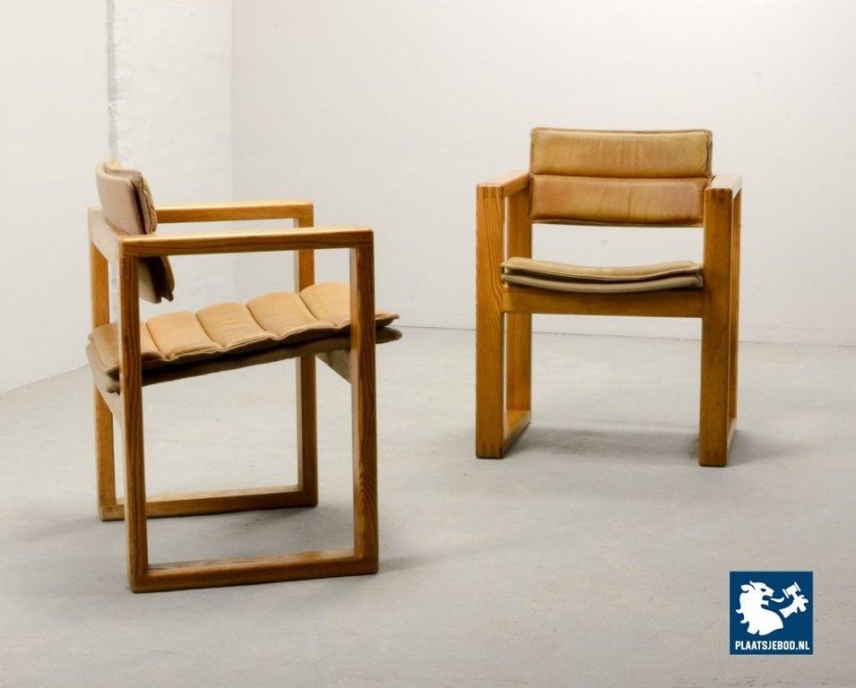 Very nice pair of Dutch design minimalistic cubic armchair / sidechair made of solid pinewood. Designed by Ate van Apeldoorn for Houtwerk Hattem. The Netherlands, 1960s. This set of robust armchair features beautifully stitched seat and backrest made of beautiful patinated camel colored leather. Dimensions: Height: 78 cm, Width: 62 cm, Depth: 48 cm, Seat height: 50 cm, Armrest height: 67 cm, Quantity: 2