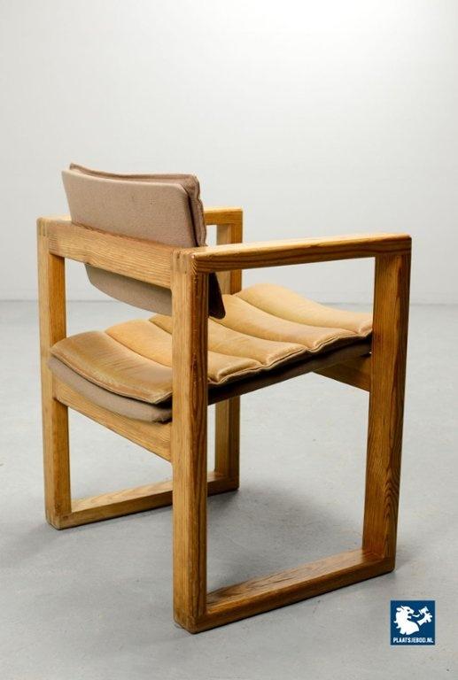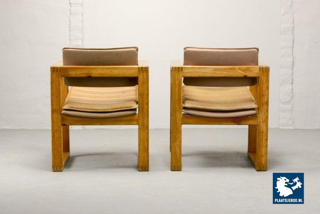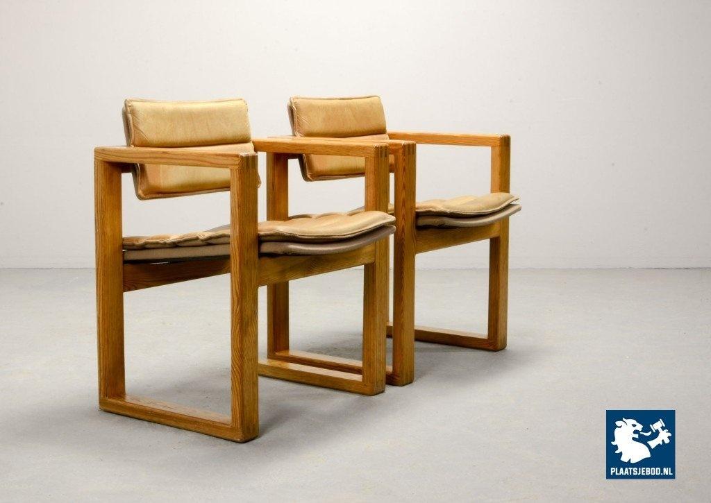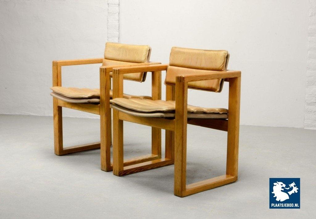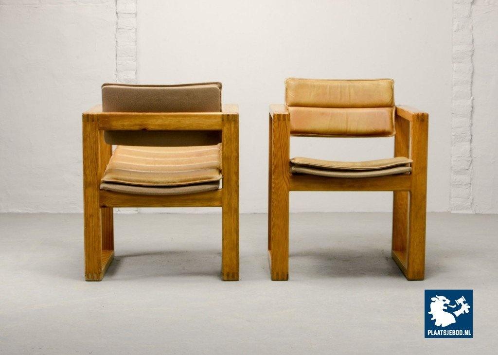 Very nice pair of Dutch design minimalistic cubic armchair / sidechair made of solid pinewood. Designed by Ate van Apeldoorn for Houtwerk Hattem. The Netherlands, 1960s. This set of robust armchair features beautifully stitched seat and backrest made of beautiful patinated camel colored leather. Dimensions: Height: 78 cm, Width: 62 cm, Depth: 48 cm, Seat height: 50 cm, Armrest height: 67 cm, Quantity: 2
