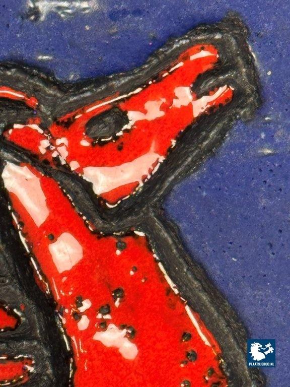 Striking Fat Lava ceramic wall tile by Ruscha Keramik, produced in West Germany during the 1960s. The tile features a powerful rearing red horse rendered in bold relief against an intense deep azure blue (Azurblau) ground. The surface is finished in Ruscha’s characteristic powdery, lava-textured matte glaze, giving the blue an exceptional depth and velvety saturation. With its substantial thickness and architectural scale, this piece reads unmistakably as a statement wall object rather than decorative wall pottery. The dynamic contrast between the sculptural red horse and the richly textured blue field is a hallmark of Ruscha’s strongest figurative designs. This piece is in excellent condition, no damage observed. Ruscha was one of the leading manufacturers of architectural and sculptural wall ceramics within the West Germany Pottery movement. Their figurative wall tiles—especially animal motifs—are among the most sought-after works from their production, valued for their bold relief, expressive glazing, and strong graphic impact. The Azurblau glaze seen here is particularly prized: a deeply saturated, matte blue that intensifies contrast and elevates the sculptural quality of the relief. Dimensions: H 42 W 23, Thick 3 cm