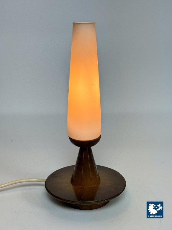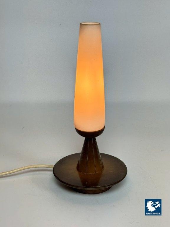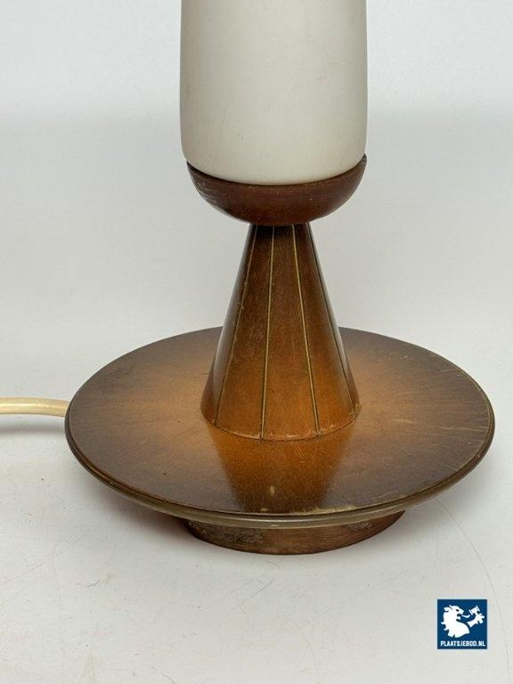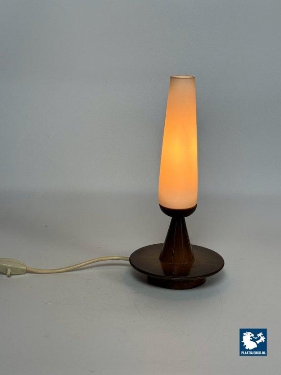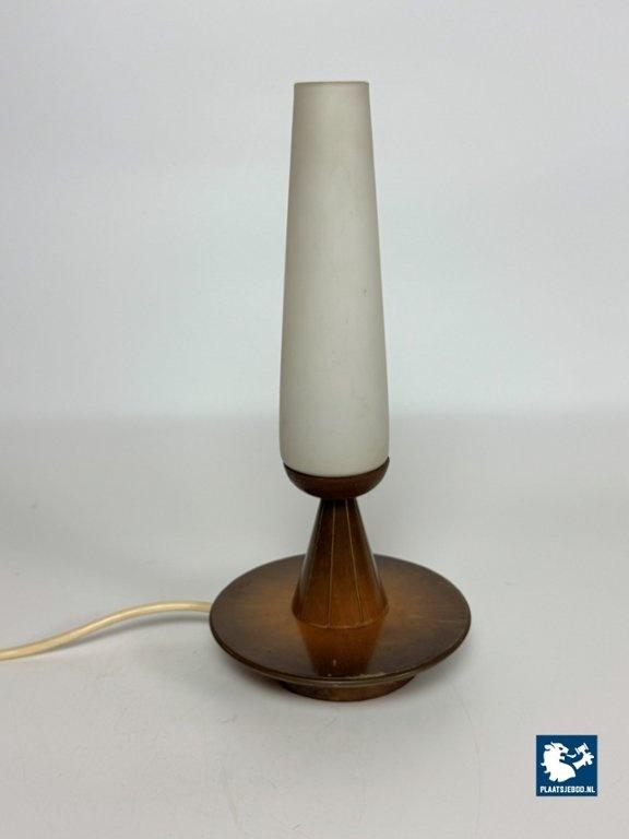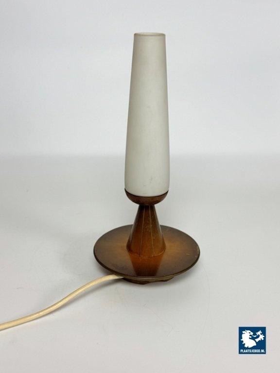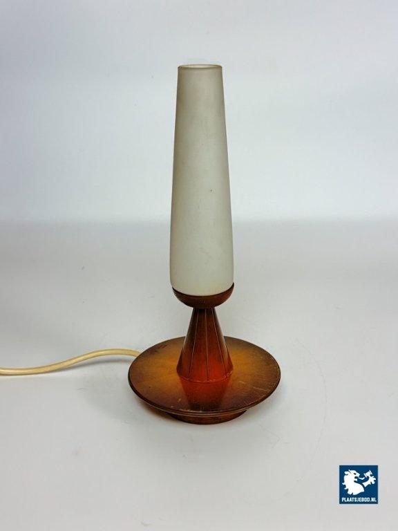 This elegant mid-century table lamp dates from the 1960s and is most likely of Scandinavian origin. The design combines a turned wooden base with a slender frosted glass tube, evoking the silhouette of a traditional hand-held candlestick reinterpreted as an electric lamp. The result is a warm, graphic and understated object with a strong sense of atmosphere. Beautifully balanced in proportion and material, this lamp works equally well as an accent light or bedside lamp. The lamp is in good vintage condition, as with all vintage items or lighting, this piece may show light signs of use, which add to its authentic character. Dimensions: Height: 32 cm, Width: 15 cm, Depth: 15 cm