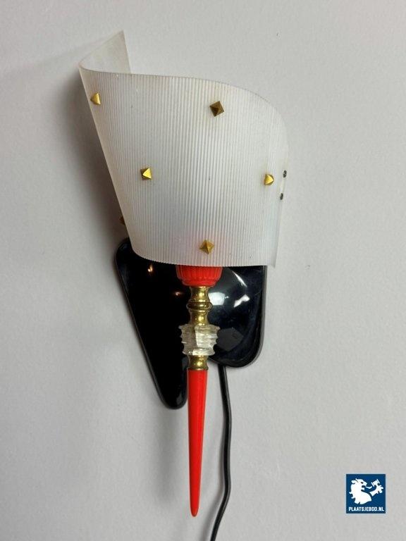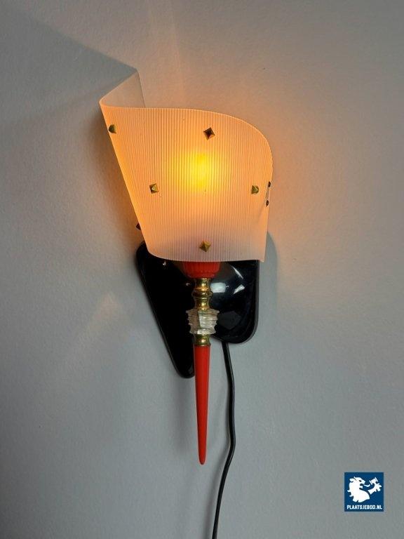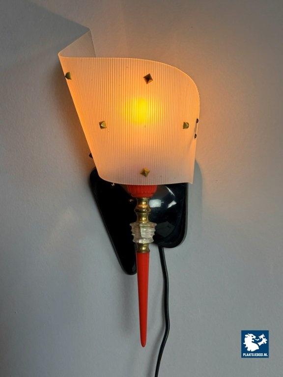 This elegant yet playful wall sconce, designed by Pierre Guariche in 1960s France, is a striking example of mid-century modern lighting. The lamp is crafted from brass and acrylic, featuring a softly curved translucent shade with subtle brass detailing. A vivid red accent stem adds a distinctive graphic touch, giving the piece its unique, lively character. When lit, it produces a warm, atmospheric glow, making it ideal as accent lighting in both modern and eclectic interiors. Compact in size yet rich in visual presence, this wall lamp functions equally well as a sculptural object and a refined source of ambient light. As with all vintage items or lighting, this piece may show light signs of use, which add to its authentic character. Dimensions: Height: 36 cm, Width: 15 cm, Depth: 12 cm