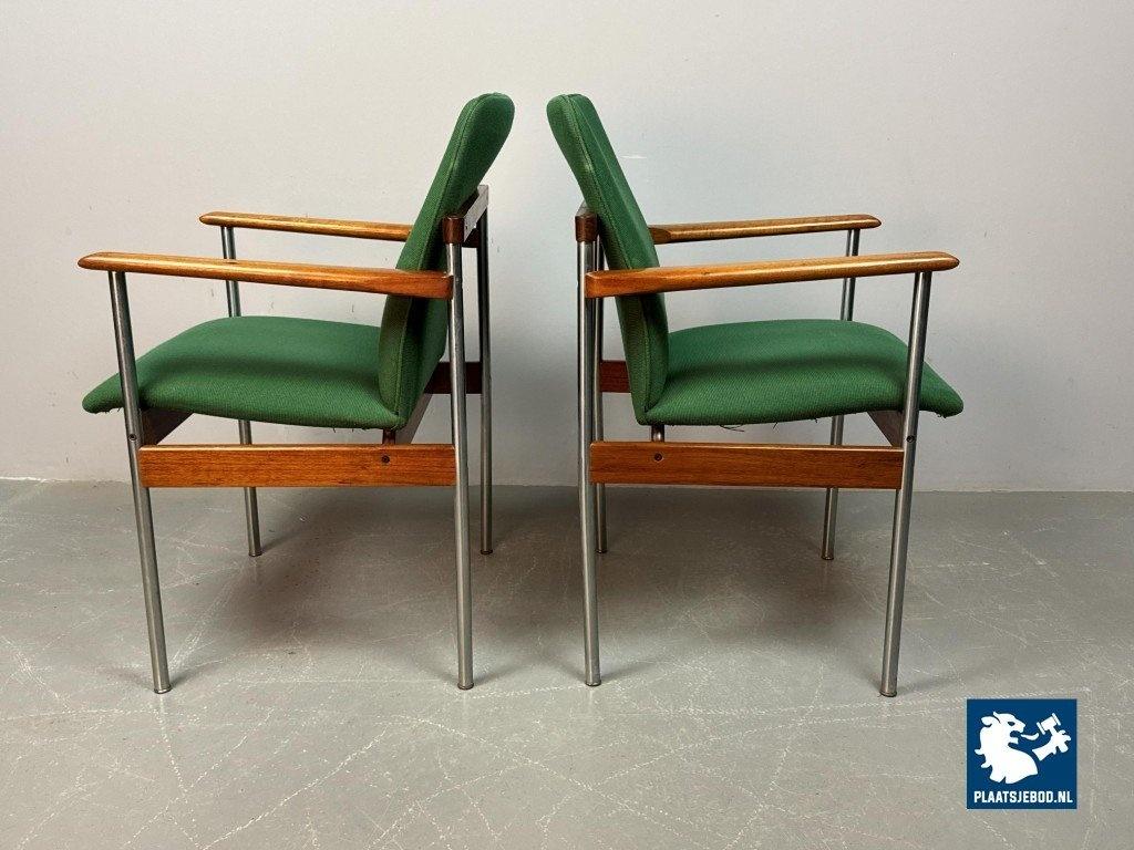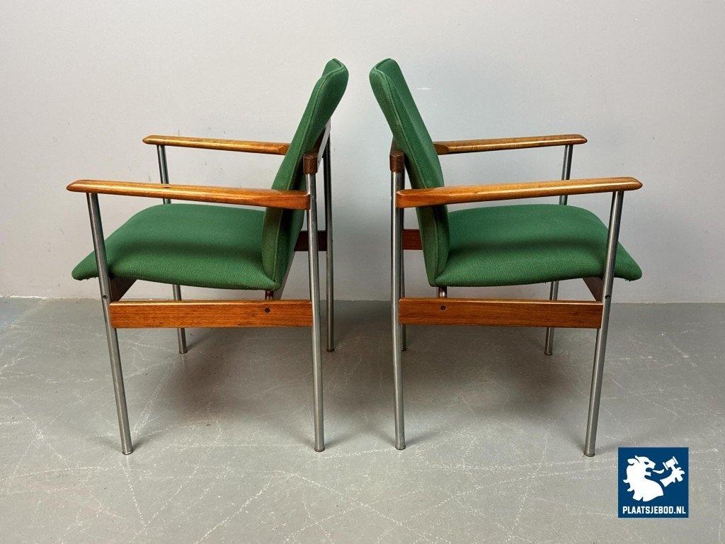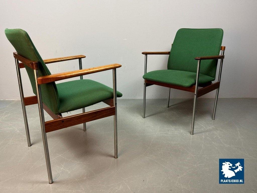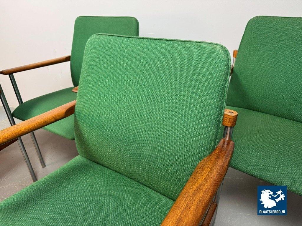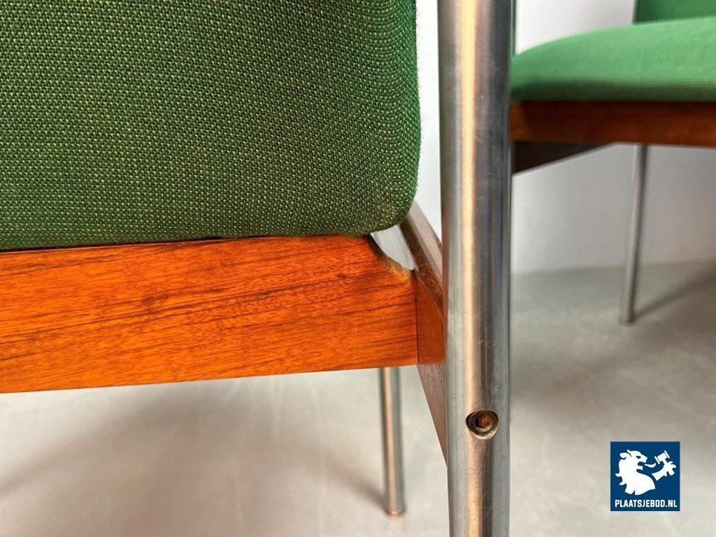The seats and gently curved backrests are upholstered in a rich green fabric, which enhances the natural tone of the teak and gives the set a calm yet distinctive modernist character. The open construction and well-proportioned silhouette are typical of high-quality post-war Dutch design, combining functionality with understated elegance. The set is in a very well preserved condition.