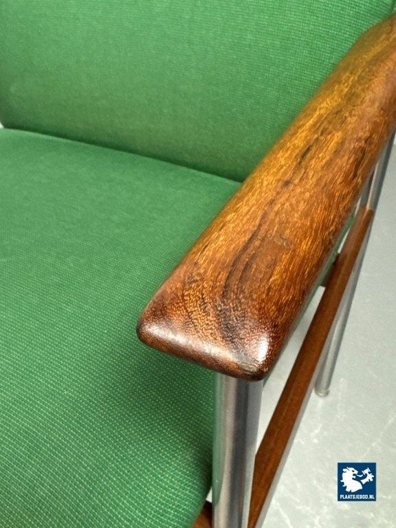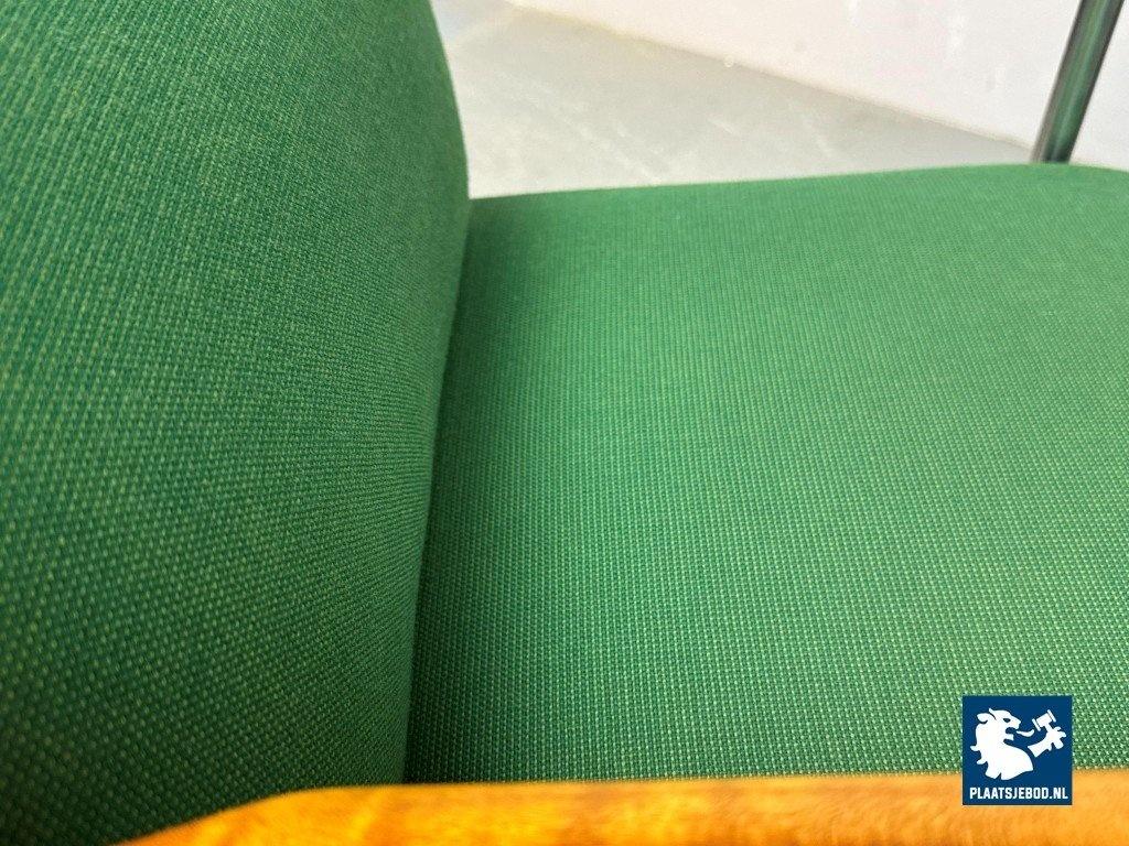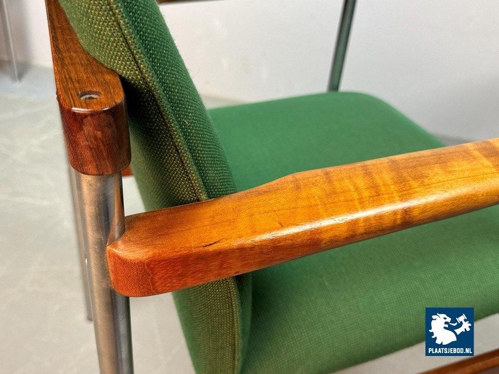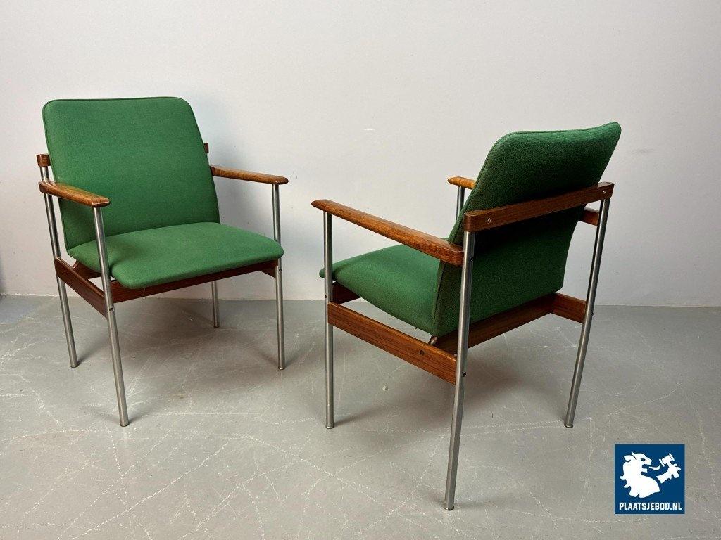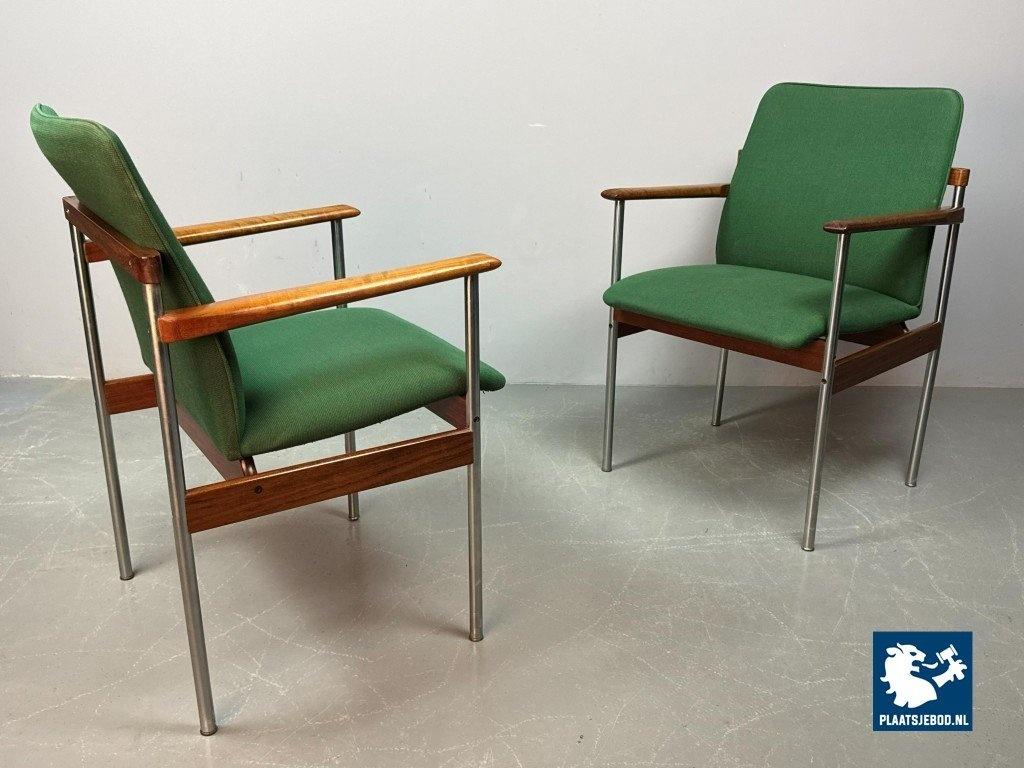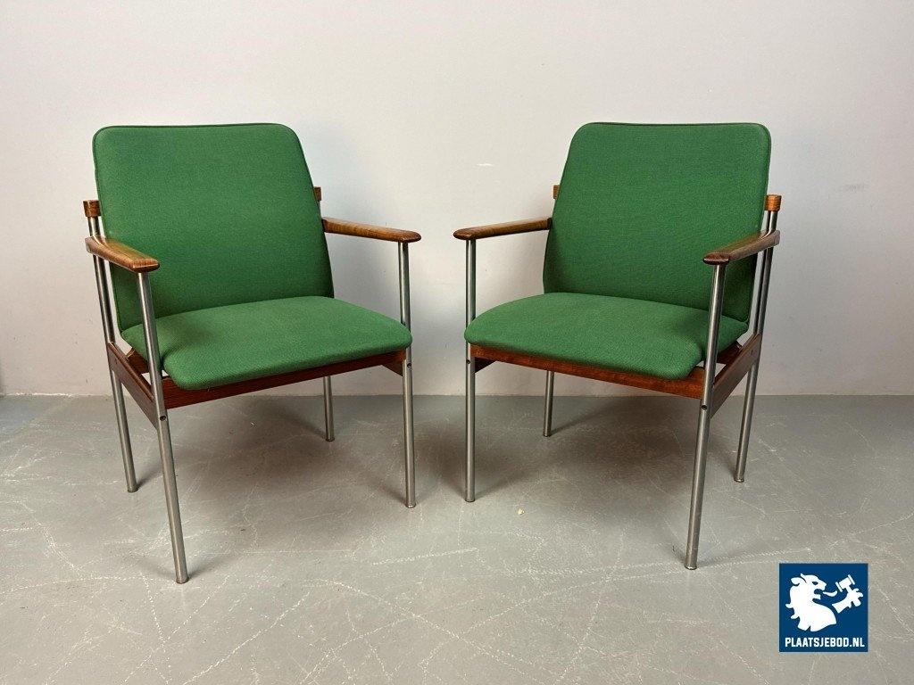 The seats and gently curved backrests are upholstered in a rich green fabric, which enhances the natural tone of the teak and gives the set a calm yet distinctive modernist character. The open construction and well-proportioned silhouette are typical of high-quality post-war Dutch design, combining functionality with understated elegance. The set is in a very well preserved condition.