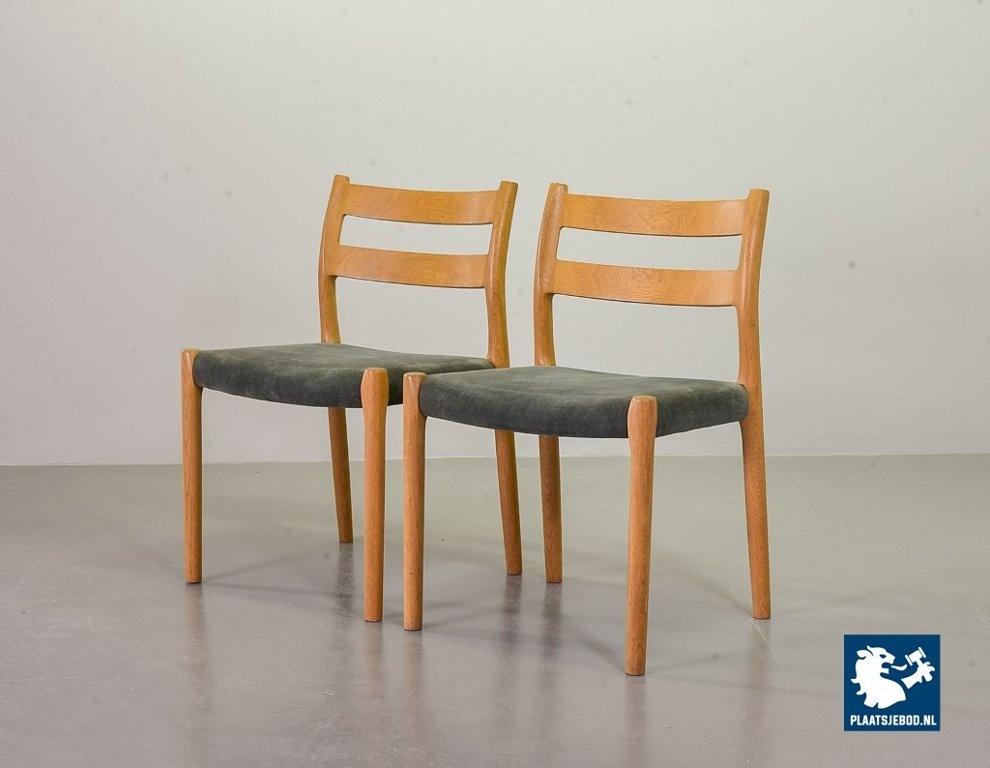 Set of four mid-century modern danish design dining chairs, model 84 by Niels Otto Moller. Manufactured by J.L. Moller Mobelfabrik, Denmark, 1960s. The solid beech wooden frame is newly upholstered with a high quality subtle greyish blue velvet fabric. The branded set is in a very good vintage condition, with minor wear consistent its age and use. Height: 76 cm / 29,9 inch, Width: 50 cm / 20 inch, Depth: 50 cm / 20 inch, Quantity: 4