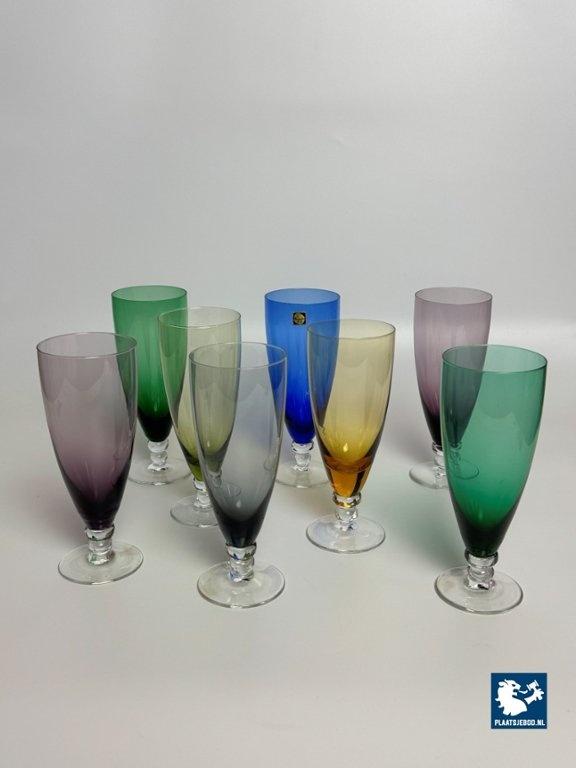 Kavel 311-016-DO-019: Set of 8 Multicolor Carnivals Beerglasses K7 Designed by Max Verboeket for Kristaluniek Maastricht. The Netherlands, 1960s.
