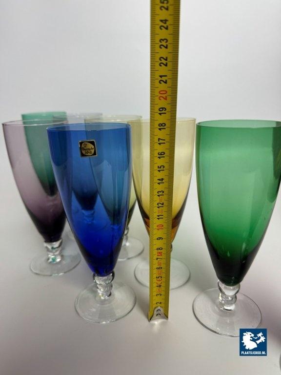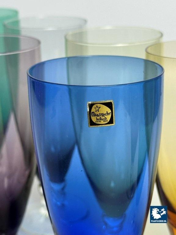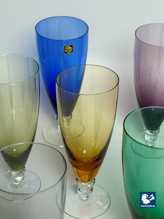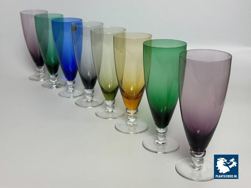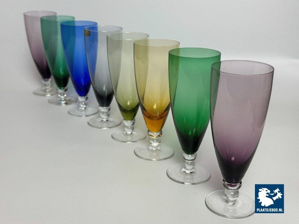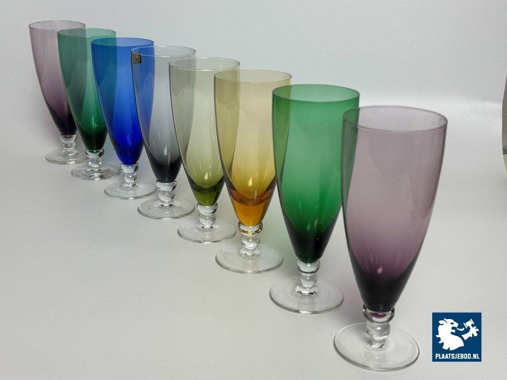 Set of 8 Multicolor Carnivals Glasses K7 Designed by Max Verboeket for Kristaluniek Maastricht. The Netherlands, 1960s.The glasses feature tall, elegant bowls in a vivid spectrum of jewel tones—emerald green, cobalt blue, amber yellow, smoky grey, soft violet and related hues—each subtly graduating into a clear stem and foot. The variation of colors within a uniform form creates a rhythmic, sculptural table presence typical of Verboeket’s modernist design language. One glass retains its original factory label, confirming authenticity. A visually strong and highly decorative ensemble, equally suited for use or display. The set is in mint condition. Dimensions: Height 18 Diameter 7 cm
