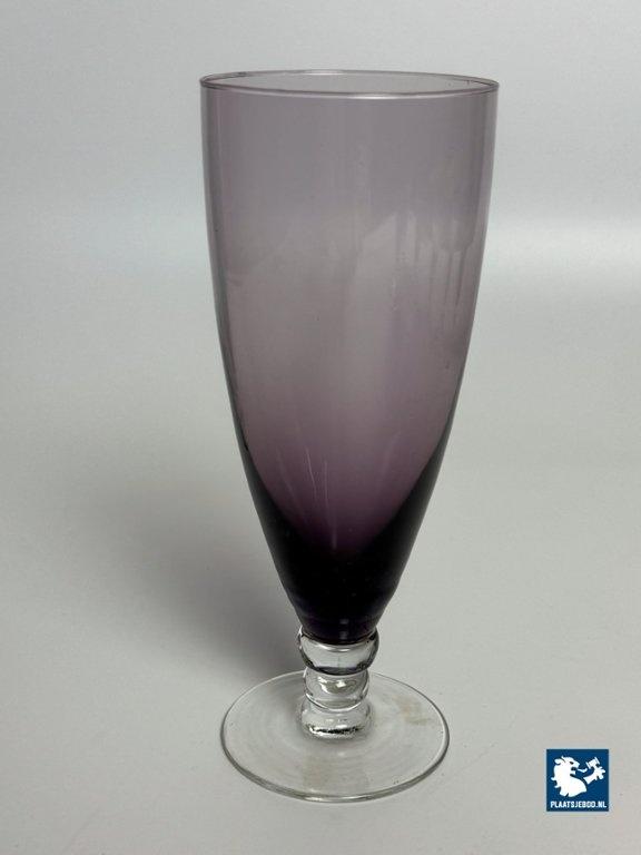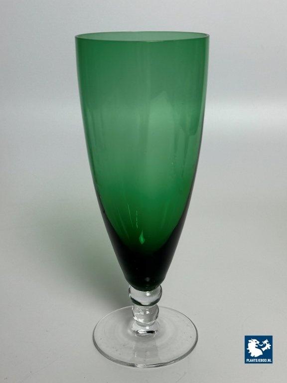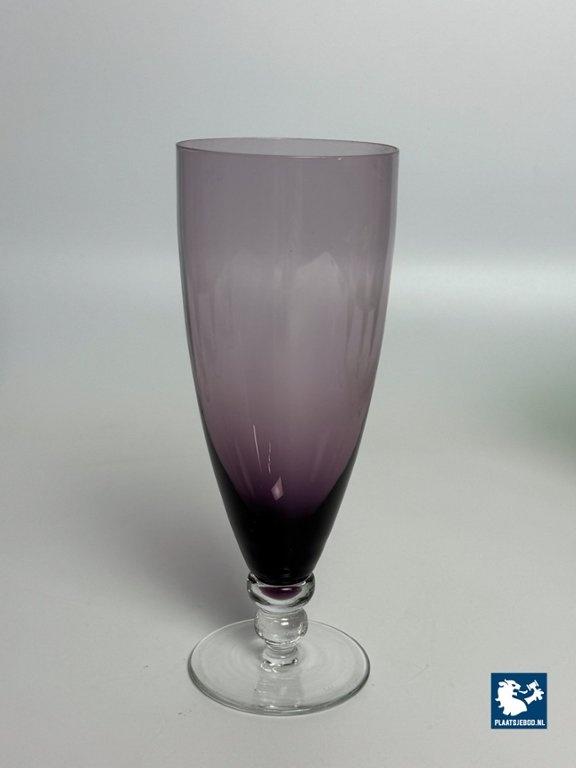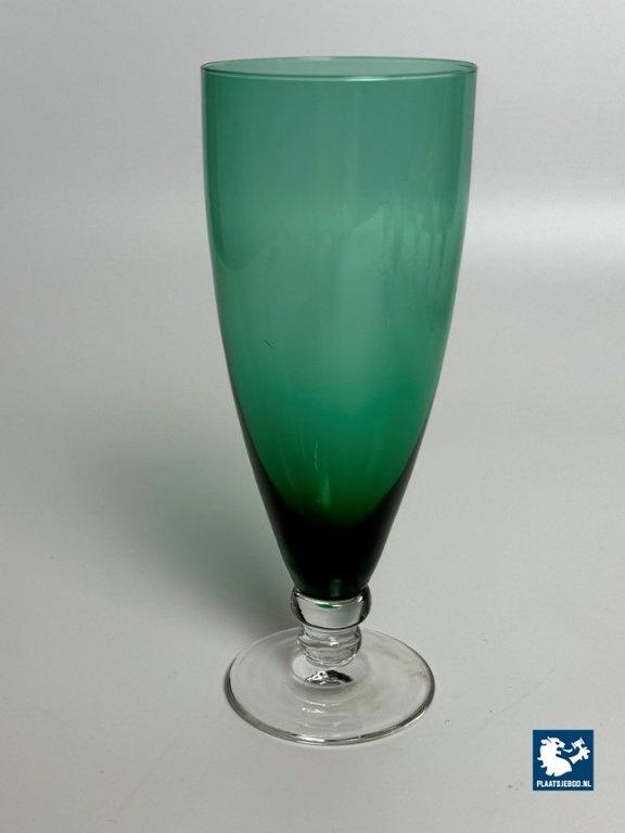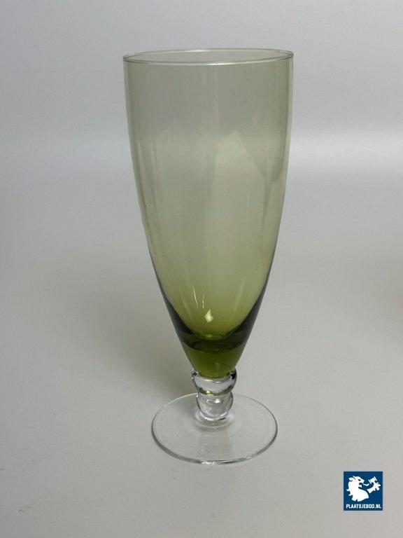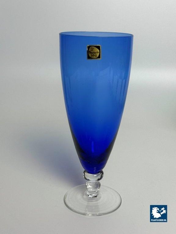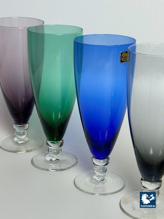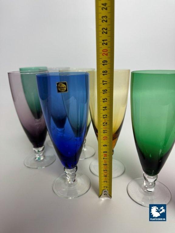 Set of 8 Multicolor Carnivals Glasses K7 Designed by Max Verboeket for Kristaluniek Maastricht. The Netherlands, 1960s.The glasses feature tall, elegant bowls in a vivid spectrum of jewel tones—emerald green, cobalt blue, amber yellow, smoky grey, soft violet and related hues—each subtly graduating into a clear stem and foot. The variation of colors within a uniform form creates a rhythmic, sculptural table presence typical of Verboeket’s modernist design language. One glass retains its original factory label, confirming authenticity. A visually strong and highly decorative ensemble, equally suited for use or display. The set is in mint condition. Dimensions: Height 18 Diameter 7 cm