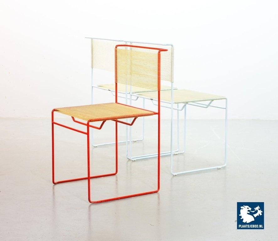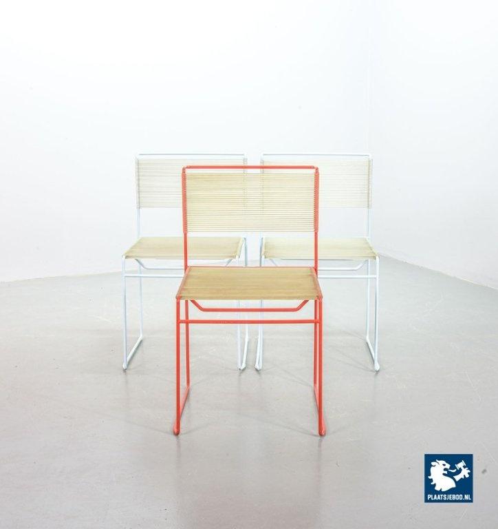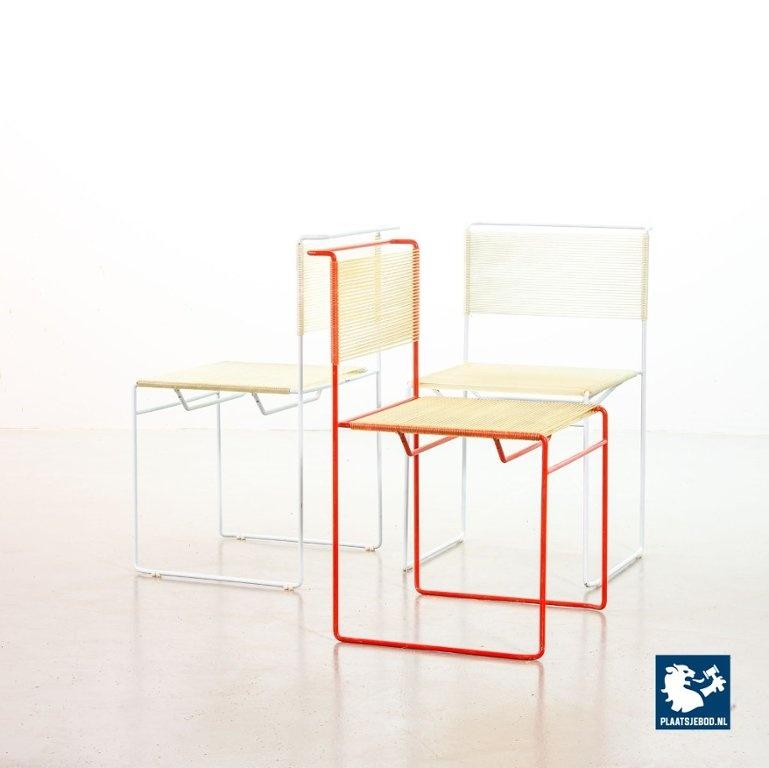 A true icon of Italian design minimalism, this vintage side chairs by Gian Domenico Bellotti for Flyline is a perfect blend of elegance and playfulness. Known as “spaghetti chairs” for their distinctive PVC cord seating and backrest, the chair features a sleek, cubic steel frame lacquered to perfection. The seat and back are hand-strung with flexible cords, creating a comfortable yet visually light silhouette. Their airy design and clean geometry give them a timeless, modern feel. This chair executed in a vibrant red color is showcasing the craftsmanship and style that made 1970s Italian design so sought after. It is in a very well preserved vintage condition, with only minor wear consistent its age and use. Dimensions: Height: 80 cm, Width: 45 cm, Depth: 46 cm, Seat height: 45 cm, Quantity: 1