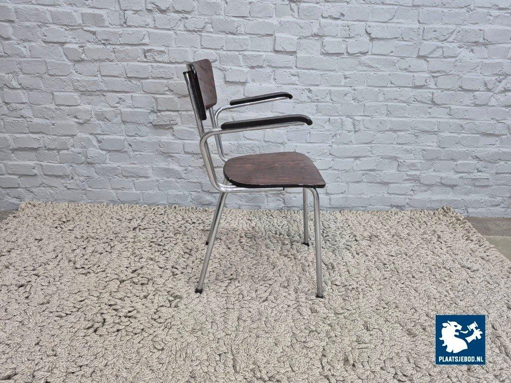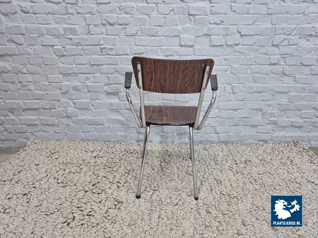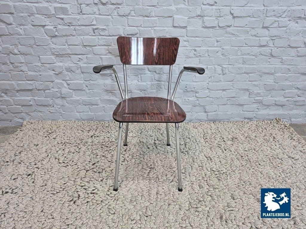 Elegant vintage design chair by Brabantia, produced in The Netherlands during the 1960s. This model is distinguished by its integrated armrests finished with black Bakelite pads, giving the chair a slightly more generous and comfortable presence than standard kitchen seating.The seat and backrest are executed in a dark brown Formica with a rich woodgrain pattern reminiscent of rosewood, offering a warm, refined appearance typical of mid-century interiors. Both elements are neatly finished with a black edge trim, while the chair stands on a chromed tubular steel frame.Originally designed as a kitchen or dining chair, this piece also works beautifully as a compact desk or occasional chair, combining practicality with understated vintage character.The chair is in very well preserved vintage condition. As with all vintage seating, it may show light signs of use, which add to its authentic character. Dimensions: Height 79 Width 55 Depth 45 Seating height 46 cm.