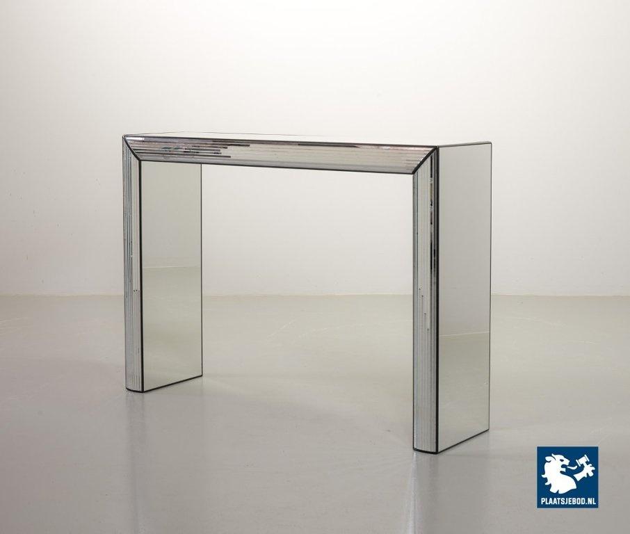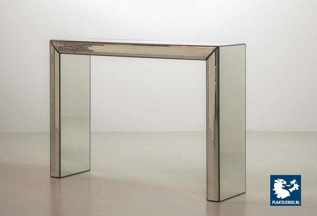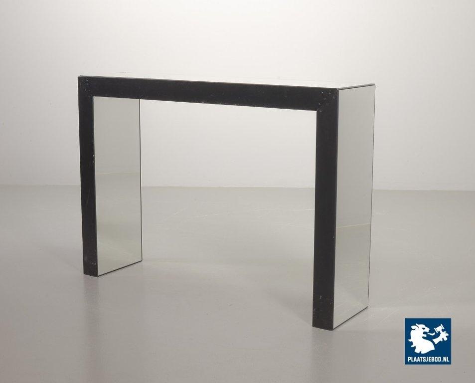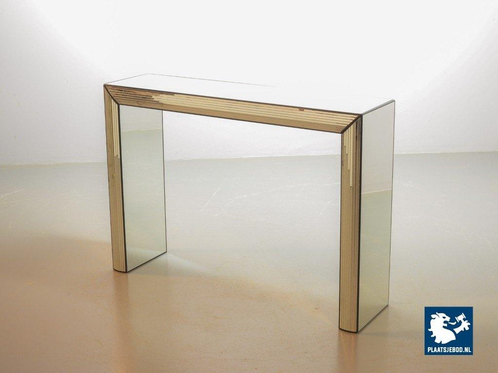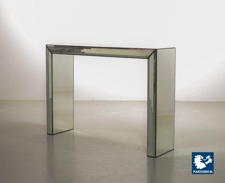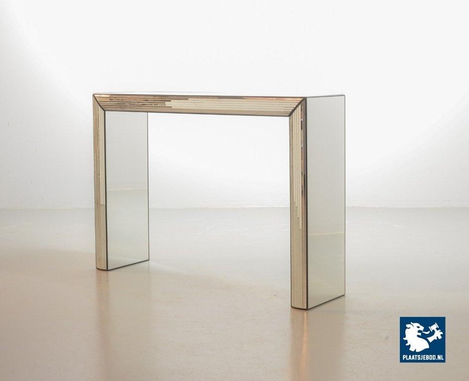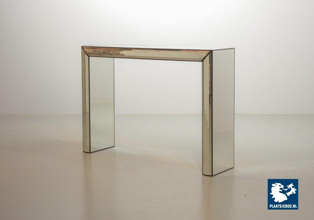 Very elegant, exclusive and rare showpiece for the real lover of vintage art. Minimalist designed in the 1980s in an inverted U-shape with the top and legs inlaid with long, slender mirror strips on the front. The condition of the table can be considered as very well preserved taking into account its prior life with some minor non disturbing wear consistent its age and use. A real eye-catcher in a hallway or as a wall object to display decorative eclectic art. Dimensions: Height: 85 cm, Width: 120 cm, Depth: 30 cm, Quantity: 1