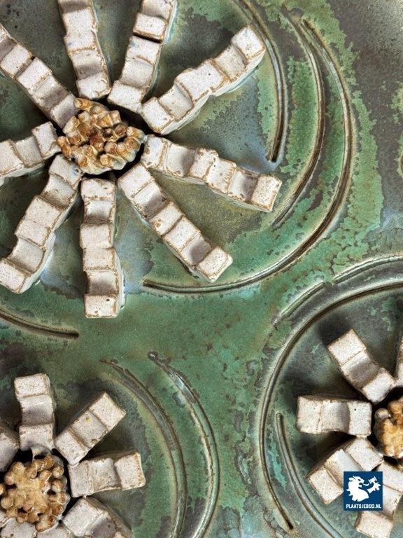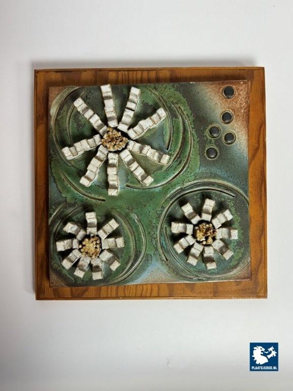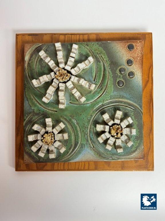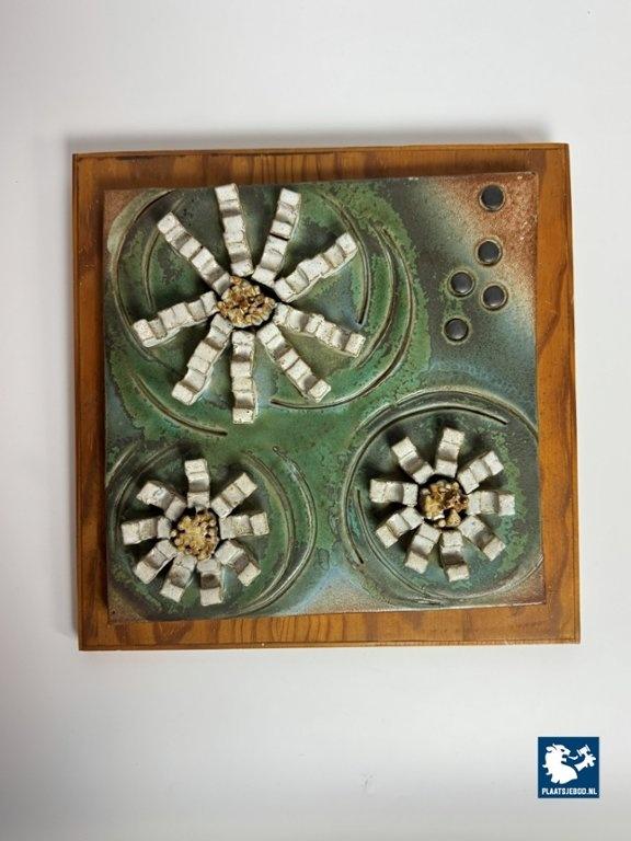Kavel 311-071-DA-081: Vintage Ceramic Wall Tile with Three White Flowers on Wooden Panel, 1960s.